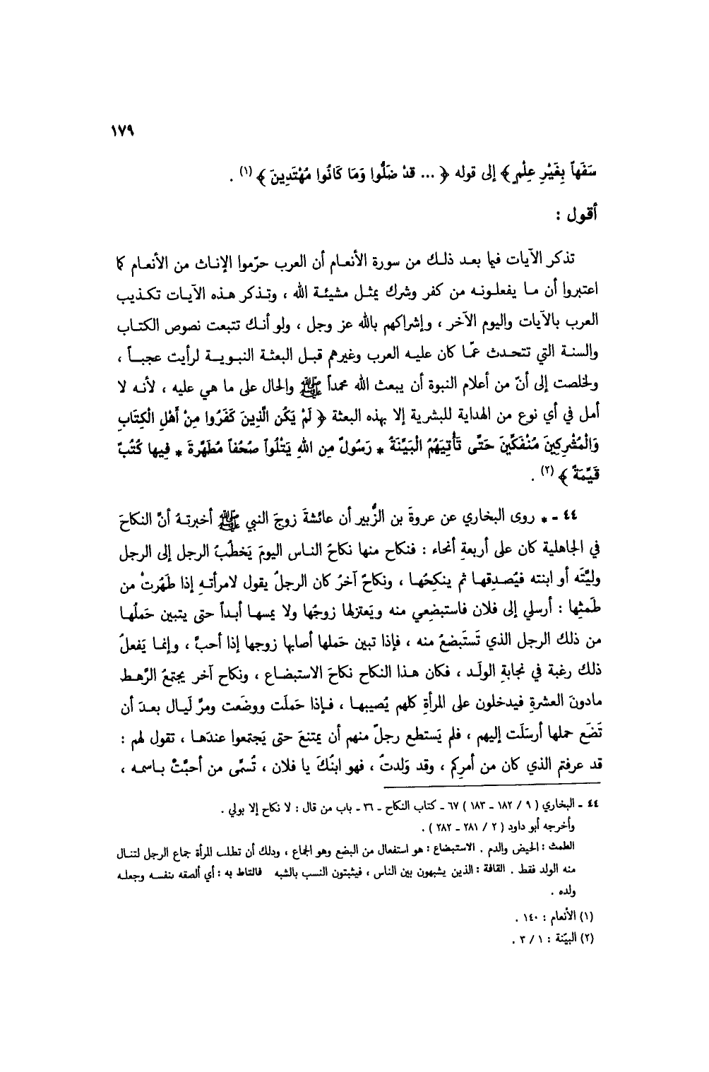44 - * روى البخاري عن عروة بن الزبير أن عائشة زوج النبي صلى الله عليه وسلم أخبرته أن النكاح في الجاهلية كان على أربعة أنحاء: فنكاح منها نكاحُ الناس اليوم يخطبُ الرجل إلى الرجل وليته أو ابنته فيصدقها ثم ينكحها، ونكاح آخر كان الرجل يقول لامرأته إذا طهرت من طمثها: أرسلي إلى فلان فاستبضعي منه ويعتزلها زوجها ولا يمسها أبداً حتى يتبين حملها من ذلك الرجل الذي تستبضع منه، فإذا تبين حملها أصابها زوجها إذا أحب، وإنما يفعل ذلك رغبة في نجابة الولد، فكان هذا النكاح نكاح الاستبضاع، ونكاح آخر يجتمع الرهط ما دون العشرة فيدخلون على المرأة كلهم يصيبها، فإذا حملت ووضعت ومر ليال بعد أن تضع حملها أرسلت إليهم، فلم يستطع رجل منهم أن يمتنع حتى يجتمعوا عندها، تقول لهم: قد عرفتم الذي كان من أمركم، وقد ولدتُ، فهو ابنك يا فلان، تسمى من أحبت باسمه،