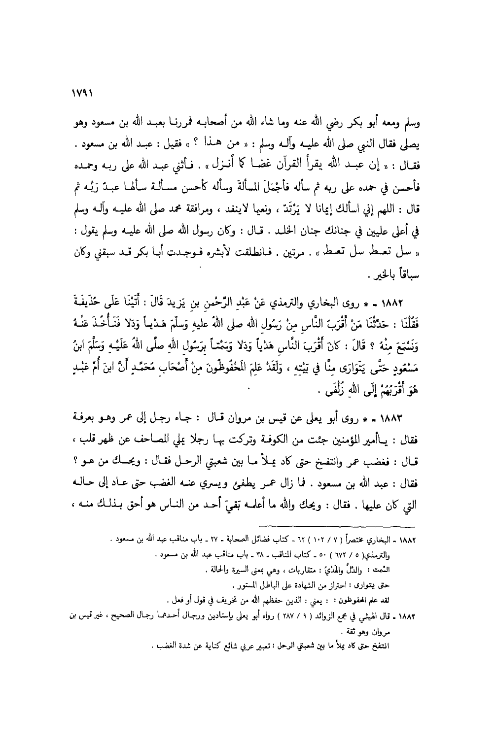 1882 - (1) روي البخاري والترمذي عبد الرحمن بن يزيد قال: أتينا على حذيفة فقلنا: حدثنا من أقرب الناس من رسول الله صلى الله عليه وسلم هدياً ودلا فنأخذ عنه ونسمع منه؟ قال: كان أقرب الناس هدياً وذلا وسمتاً برسول الله صلى الله عليه وسلم ابن مسعود حتى يتوارى منا في بيته، ولقد علم المحفوظون من أصحاب محمد أن ابن أم عبد هو أقربهم إلى الله زلفى.