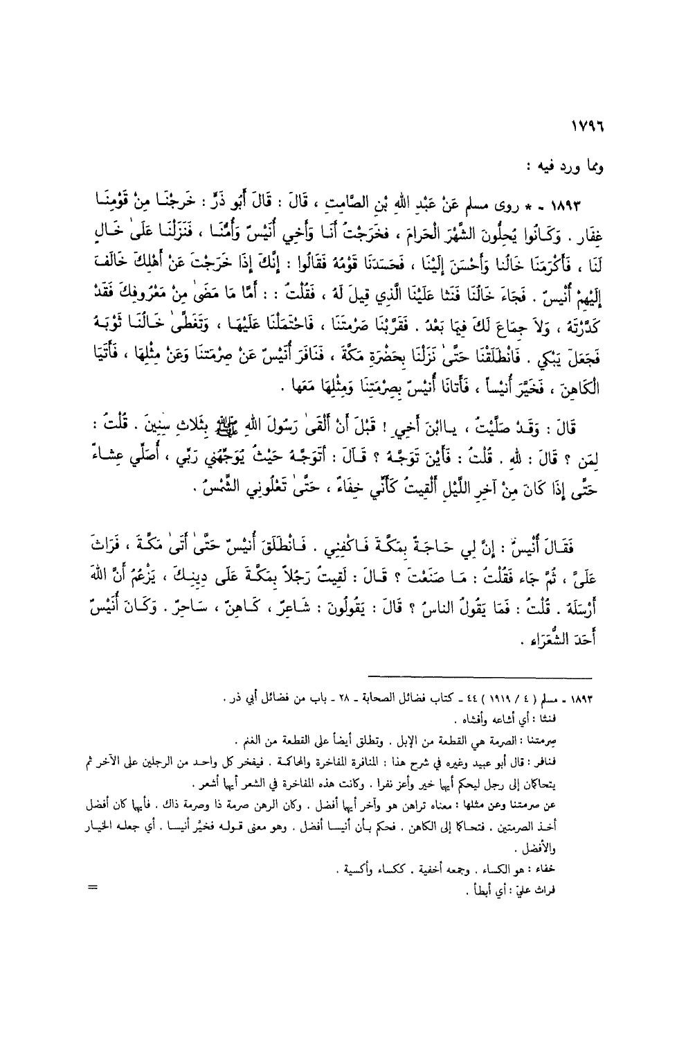 1893 - * روى مسلم عن عبد الله بن الصامت، قال: قال أبو ذر: خرجنا من قومنا غفار. وكانوا يحلون الشهر الحرام، فخرجت أنا وأخي أنيس وأمنا، فنزلنا على خال لنا، فأكرمنا خالنا وأحسن إلينا، فحسدنا قومه فقالوا: إنك إذا خرجت عن أهلك خالف إليهم أنيس. فجاء خالنا فنثا علينا الذي قيل له، فقلت: أما ما مضى من معروفك فقد كدرته، ولا جماع لك فيما بعد. فقربنا صرمتنا، فاحتملنا عليها، وتغطى خالنا ثوبة فجعل يبكي. فانطلقتا حتى نزلنا بحضرة ملكة، فنافر أنيس عن صرمتنا وعن مثلها، فأتيا الكاهن، فخير أنيساً، فأتانا بصرمتنا ومثلها معها.