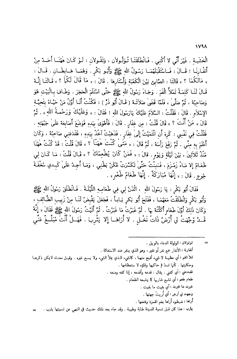 الخشبة. غير أني لا أكني. فانطلقتا تولولان وتقولان: لو كان هاهنا أحد من أنفارنا! قال: فاستقبلهما رسول الله صلى الله عليه وسلم وأبو بكر. وهما هابطان، فقال: "ما لكما؟ " قالتا: الصابئ بين الكعبة وأستارها. قال: " ما قال لكما؟ " قالتا: إنه قال لنا كلمة تملأ الفم. وجاء رسول الله صلى الله عليه وسلم حتى استلم الحجر. وطاف بالبيت هو وصاحبه، ثم صلى، فلما قضى صلاته (قال أبو ذر): فكنت أنا أول من حياه بتحية الإسلام، قال: فقلت: السلام عليك يا رسول الله! فقال: "وعليك ورحمة الله". ثم قال: "من أنت؟ "، قال قلت: من غفار. قال: فأهوى بيده فوضع أصابعه على جبهته. فقلت في نفسي: كره أن انتميت إلى غفار، فذهبت آخذ بيده، فقدعني صاحبه، وكان أعلم به مني. ثم رفع رأسه، ثم قال: "متى كنت ههنا؟ " قال قلت: قد كنت ههنا منذ ثلاثين، بين ليلة ويوم، قال: "فمن كان يطعمك؟ " قال قلت: ما كان لي طعام إلا ماء زمزم، فسمنت حتى تكسرت عكن بطني، وما أجد على كبدي سخفة جوع. فقال: "إنها مباركة. إنها طعام طعم".