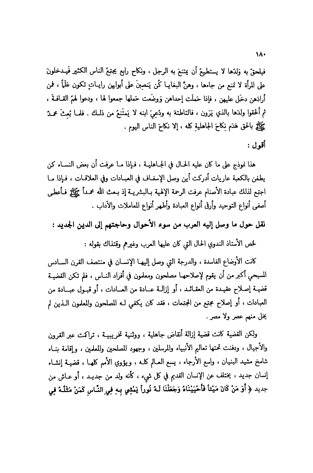 ولكن القضية كانت قضية إزالة أنقاض جاهلية، ووثنية تخريبية، تراكمت عبر القرون والأجيال، ودفنت تحتها تعاليم الأنبياء والمرسلين، وجهود المصلحين والمعلمين، وإقامة بناء شامخ مشيد البنيان، واسع الأرجاء، يسع العالم كله، ويؤوي الأمم كلها، قضية إنشاء إنسان جديد، يختلف عن الإنسان القديم في كل شيء، كأنه ولد من جديد، أو عاش من جديد {أَوَمَنْ كَانَ مَيْتًا فَأَحْيَيْنَاهُ وَجَعَلْنَا لَهُ نُورًا يَمْشِي بِهِ فِي النَّاسِ كَمَنْ مَثَلُهُ فِي