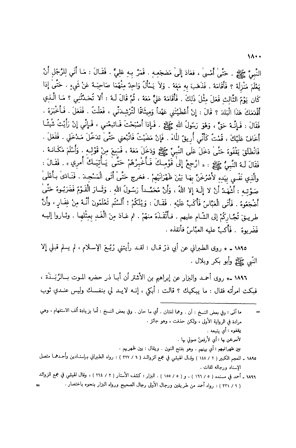 1896 - * روى أحمد والبزار عن إبراهيم بن الأشتر أن أبا ذر حضره الموت بالرٌبذَة، فبكت امرأته فقال: ما يبكيك؟ قالت: أبكي، إنه لا يد لي بنفسك وليس عندي ثوب.
