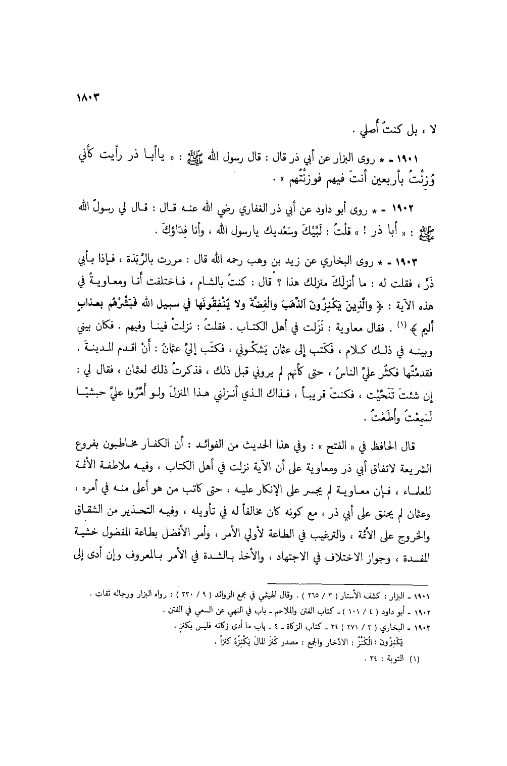 1903 - * روى البخاري عن زيد بن وهب رحمه الله قال: مررت بالربذة، فإذا بأبي ذر، فقلت له: ما أنزلك منزلك هذا؟ قال: كنت بالشام، فاختلفت أنا ومعاوية في هذه الآية: {وَالَّذِينَ يَكْنِزُونَ الذَّهَبَ وَالْفِضَّةَ وَلَا يُنْفِقُونَهَا فِي سَبِيلِ اللَّهِ فَبَشِّرْهُمْ بِعَذَابٍ أَلِيمٍ} (1). فقال معاوية: نزلت في أهل الكتاب. فقلت: نزلت فينا وفيهم. فكان بيني وبينه في ذلك كلام، فكتب إلى عثمان يشكوني، فكتب إلي عثمان: أن اقدم المدينة. فقدمتها فكثر علي الناس، حتى كأنهم لم يروني قبل ذلك، فذكرت ذلك لعثمان، فقال لي: إن شئت تنحيت، فكنت قريباً، فذاك الذي أنزلني هذا المنزل ولو أمروا علي جبشياً لسمعت وأطعت.