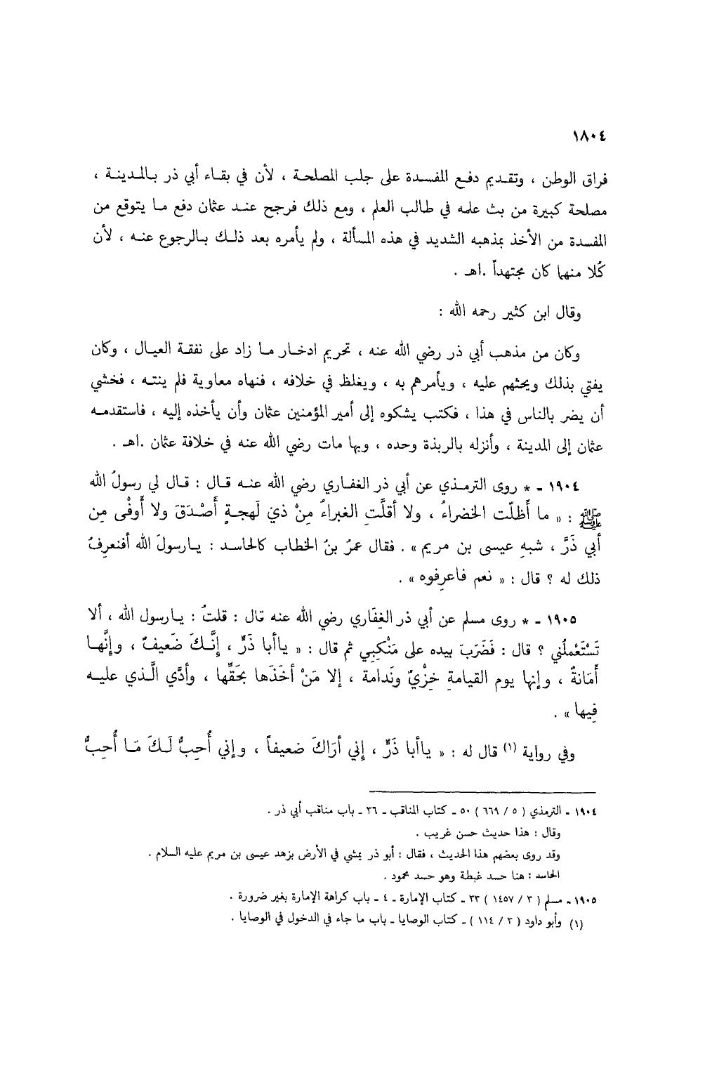 وكان من مذهب أبي ذر رضي الله عنه، تحريم ادخار ما زاد على نفقة العيال، وكان يفتي بذلك ويحثهم عليه، ويأمرهم به، ويغلظ في خلافه، فنهاه معاوية فلم ينته، فخشي أن يضر بالناس في هذا، فكتب يشكوه إلى أمير المؤمنين عثمان وأن يأخذه إليه، فاستقدمه عثمان إلى المدينة، وأنزله بالربذة وحده، وبها مات رضي الله عنه في خلافة عثمان. اهـ.