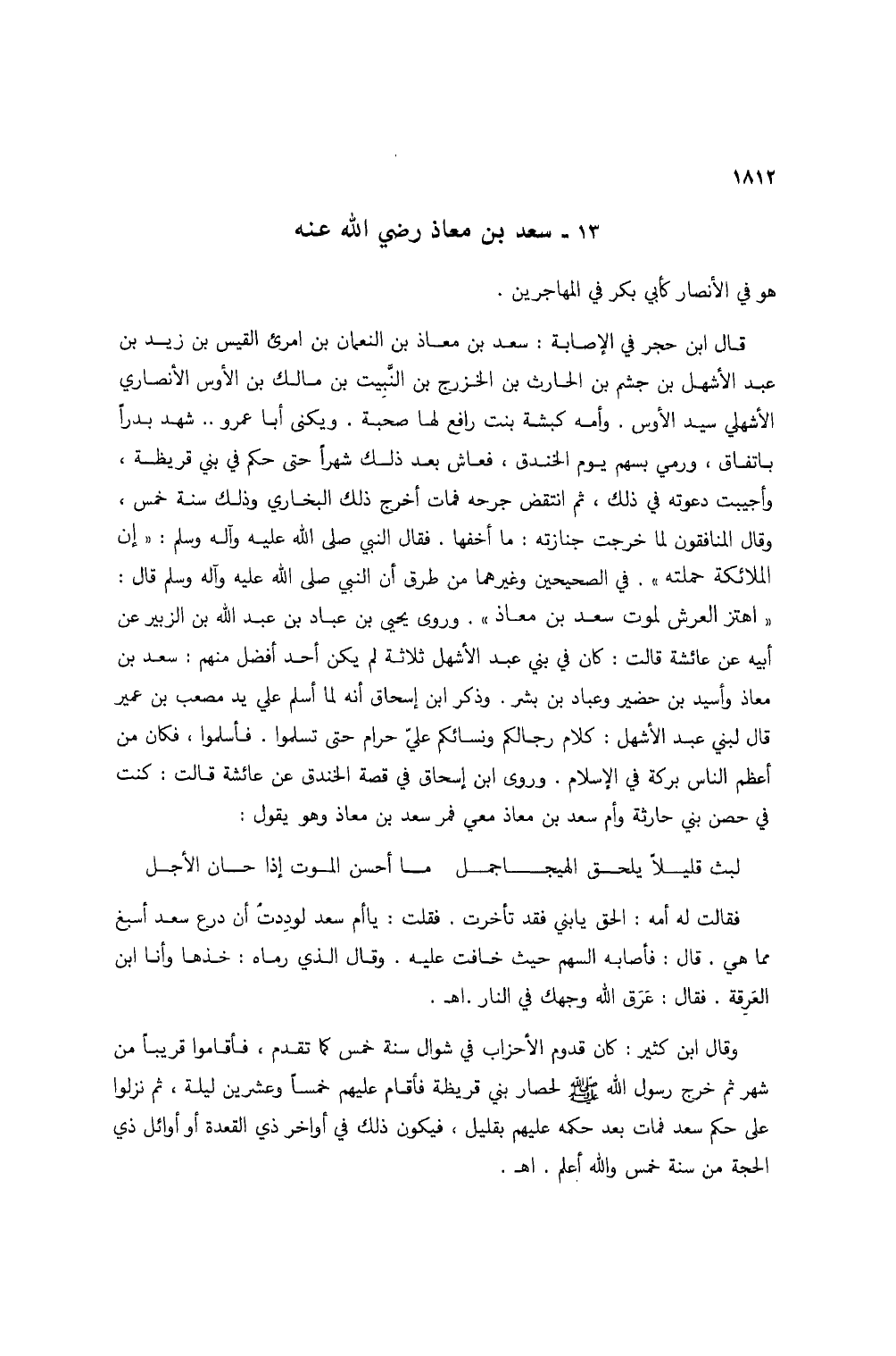 قال ابن حجر في الإصابة: سعد بن معاذ بن النعمان بن امرئ القيس بن زيد بن عبد الأشهل بن جشم بن الحارث بن الخزرج بن النبيت بن مالك بن الأوس الأنصاري الأشهلي سيد الأوس. وأمه كبشة بنت رافع لها صحبة. ويكنى أبا عمرو .. شهد بدراً باتفاق، ورمي بسهم يوم الخندق، فعاش بعد ذلك شهراً حتى حكم في بني قريظة، وأجيبت دعوته في ذلك، ثم انتقض جرحه فمات أخرج ذلك البخاري وذلك سنة خمس، وقال المنافقون لما خرجت جنازته: ما أخفها. فقال النبي صلى الله عليه وآله وسلم: «إن الملائكة حملته». في الصحيحين وغيرهما من طرق النبي صلى الله عليه وآله وسلم قال: «اهتز العرش لموت سعد بن معاذ». وروى يحيي بن عباد بين عبد الله بن الزبير عن أبيه عن عائشة قالت: كان في بني عبد الأشهل ثلاثة لم يكن أحد أفضل منهم: سعد بن معاذ وأسيد بن حضير وعباد بن بشر. وذكر ابن إسحاق أنه لما أسلم علي يد مصعب بن عمير قال لبني عبد الأشهل: كلام رجالكم ونسائكم علي حرام حتى تسلموا. فأسلموا، فكان من أعظم الناس بركة في الإسلام. وروى ابن إسحاق في قصة الخندق عن عائشة قالت: كنت في حصن بني حارثة وأم سعد بن معاذ معي فمر سعد بن معاذ وهو يقول: