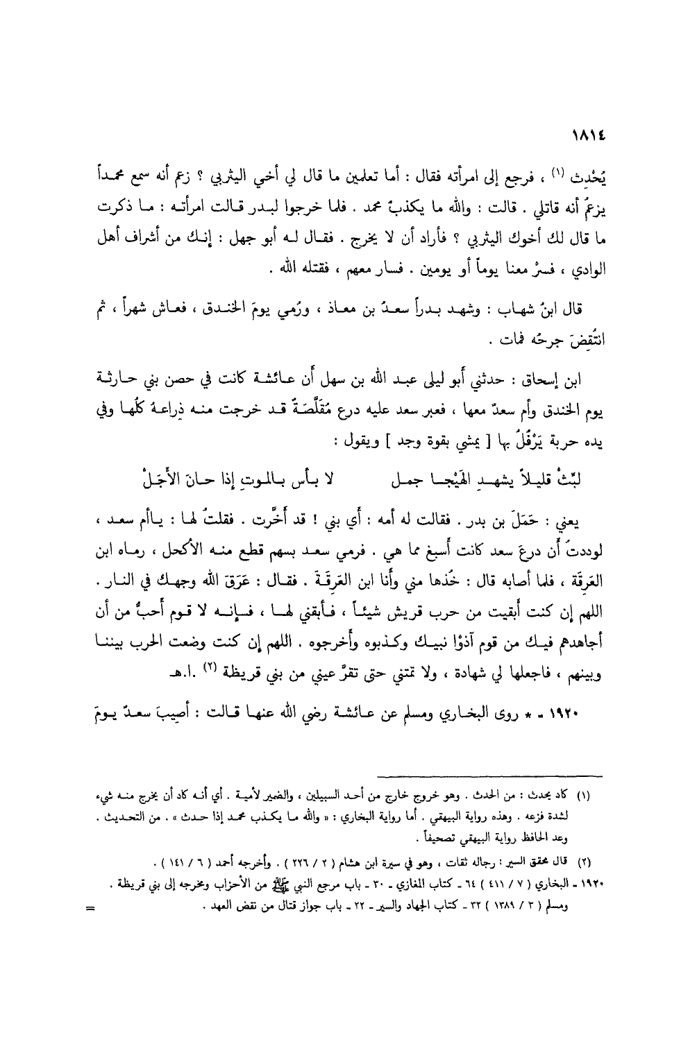 يعني: حمل بن بدر. فقالت له أمه: أي بني! قد أخرت. فقلت لها: يا أم سعد، لوددت أن درع سعد كانت أسبغ مما هي. فرمي سعد بسهم قطع منه الأكحل، رماه ابن العرقة، فلما أصابه قال: خذها مني وأنا ابن العرقة. فقال: عرق الله وجهك في النار. اللهم إن كنت أبقيت من حرب قريش شيئاً، فأبقني لها، فإنه لا قوم أحب من أن أجاهدهم فيك من قوم آذوا نبيك وكذبوه وأخرجوه. اللهم إن كنت وضعت الحرب بيننا وبينهم، فاجعلها لي شهادة، ولا تمتني حتى تقر عيني من بني قريظة (2). أ. هـ.