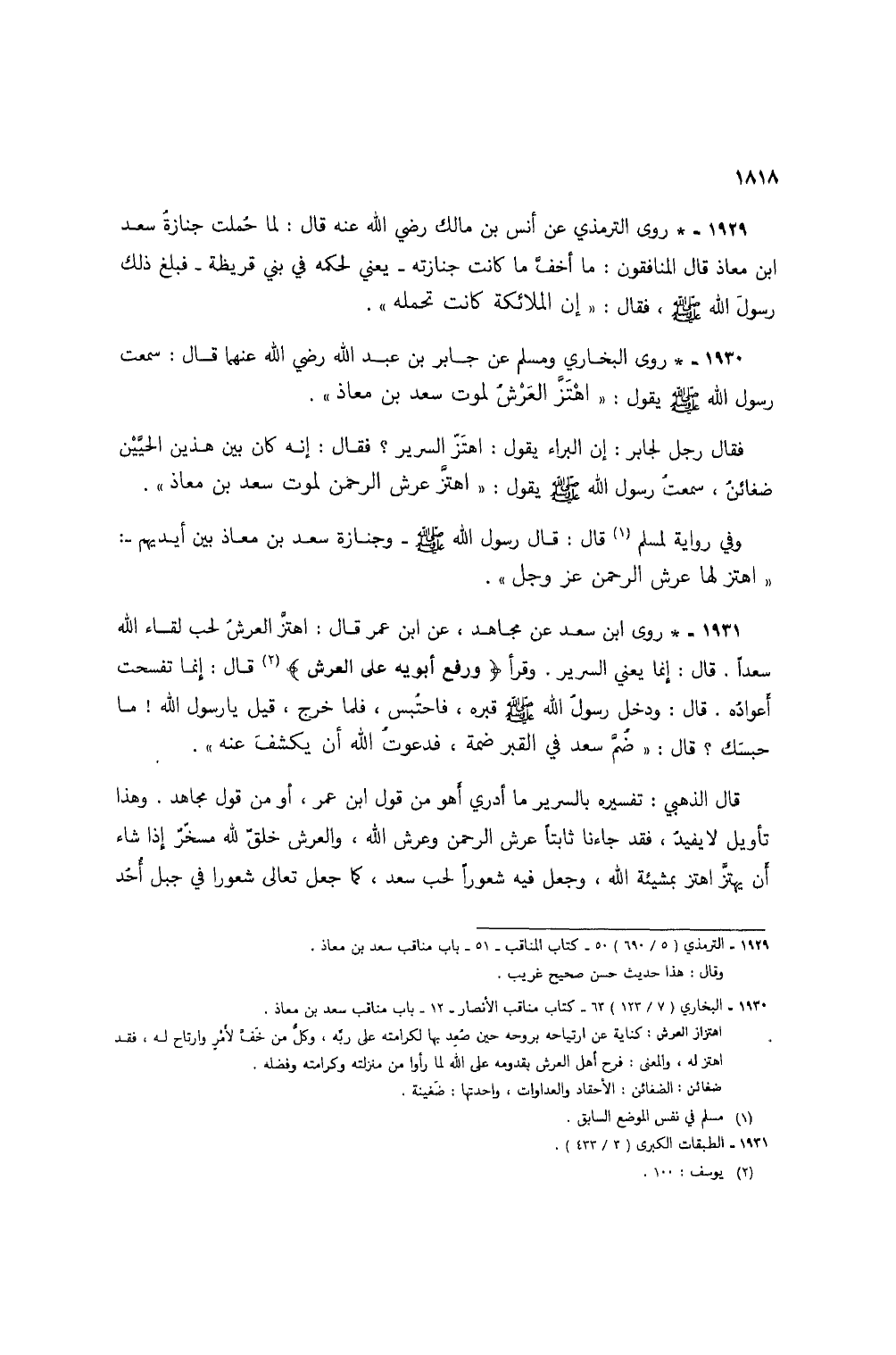 1930 - * روى البخاري ومسلم عن جابر بن عبد الله رضي الله عنهما قال: سمعت رسول الله صلى الله عليه وسلم يقول: «اهتز العرش لموت سعد بن معاذ».