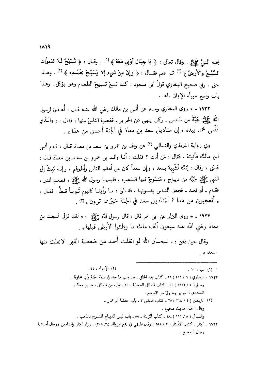 1932 - * روى البخاري ومسلم عن أنس بن مالك رضي الله عنه قال: أهدي لرسول الله صلى الله عليه وسلم جبة من سندس - وكان ينهي عن الحرير - فعجب الناس منها، فقال: «والذي نفس محمد بيده، إن مناديل سعد بن معاذ في الجنة أحسن من هذا».