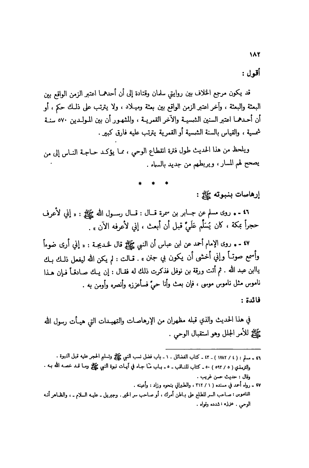 47 - * روى الإمام أحمد عن ابن عباس أن النبي صلى الله عليه وسلم قال لخديجة: "إني أرى ضوءاً وأسمع صوتاً وإني أخشى أن يكون بي جنن". قالت: لم يكن الله ليفعل ذلك بك يا ابن عبد الله. ثم أتت ورقة بن نوفل فذكرت ذلك له فقال: إن يك صادقاً فإن هذا ناموس مثل ناموس موسى، فإن بعث وأنا حي فسأعززه وأنصره وأومن به.
