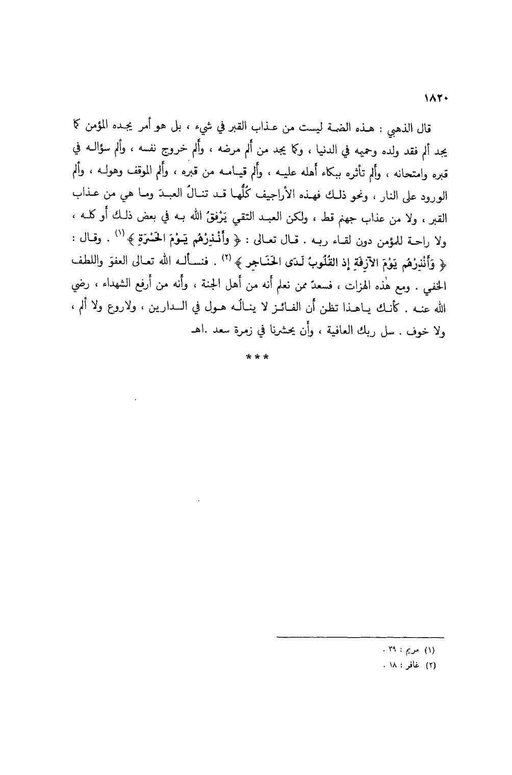 قال الذهبي: هذه الضمة ليست من عذاب القبر في شيء، بل هو أمر يجده المؤمن كما يجد ألم فقد ولده وحميمه في الدنيا، وكما يجد من ألم مرضه، وألم خروج نفسه، وألم سؤاله في قبره وامتحانه، وألم تأثره ببكاء أهله عليه، وألم قيامه من قبره، وألم الموقف وهوله، وألم الورود على النار، ونحو ذلك فهذه الأراجيف كلها قد تنال البعد وما هي من عذاب القبر، ولا من عذاب جهنم قط، ولكن العبد التقي يرفق الله به في بعض ذلك أو كله، ولا راحة للمؤمن دون لقاء ربه. قال تعالى: {وَأَنْذِرْهُمْ يَوْمَ الْحَسْرَةِ} (1). وقال: {وَأَنْذِرْهُمْ يَوْمَ الْآزِفَةِ إِذِ الْقُلُوبُ لَدَى الْحَنَاجِرِ} (2). فنسأله الله تعالى العفو واللطف الخفي. ومع هذه المزات، فسعد ممن نعلم أنه من أهل الجنة، وأنه من أرفع الشهداء، رضي الله عنه. كأنك يا هذا تظن أن الفائز لا يناله هول في الدارين، ولا روع ولا ألم، ولا خوف. سل ربك العافية، وأن يحسرنا في زمرة سعد. اهـ.