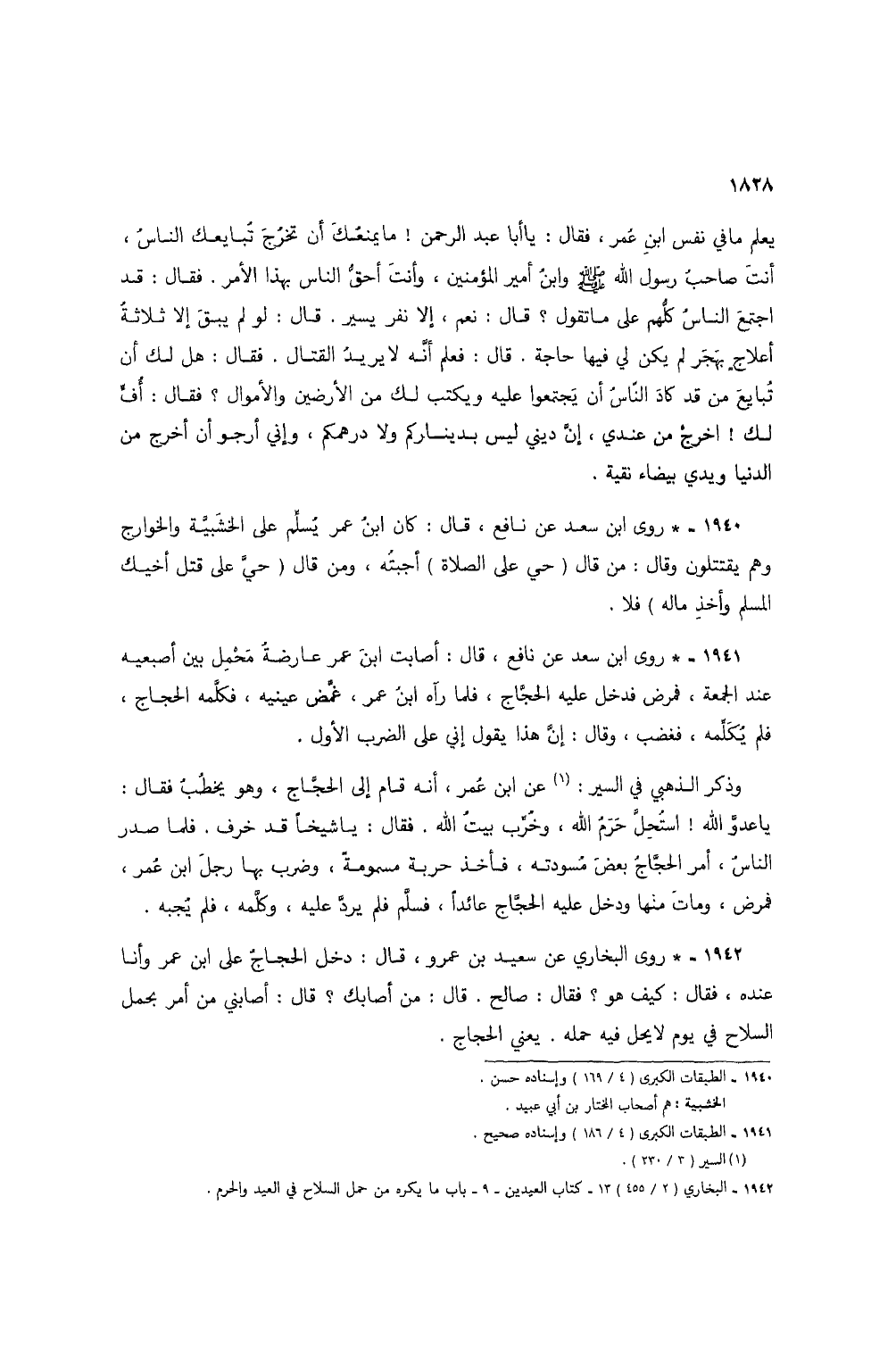 1942 - * روى البخاري عن سعيد بن عمرو، قال: دخل الحجاج على ابن عمر وأنا عنده، فقال: كيف هو؟ فقال: صالح. قال: من أصابك؟ قال: أصابني من أمر بحمل السلاح في يوم لا تحل فيه حمله. يعني الحجاج.