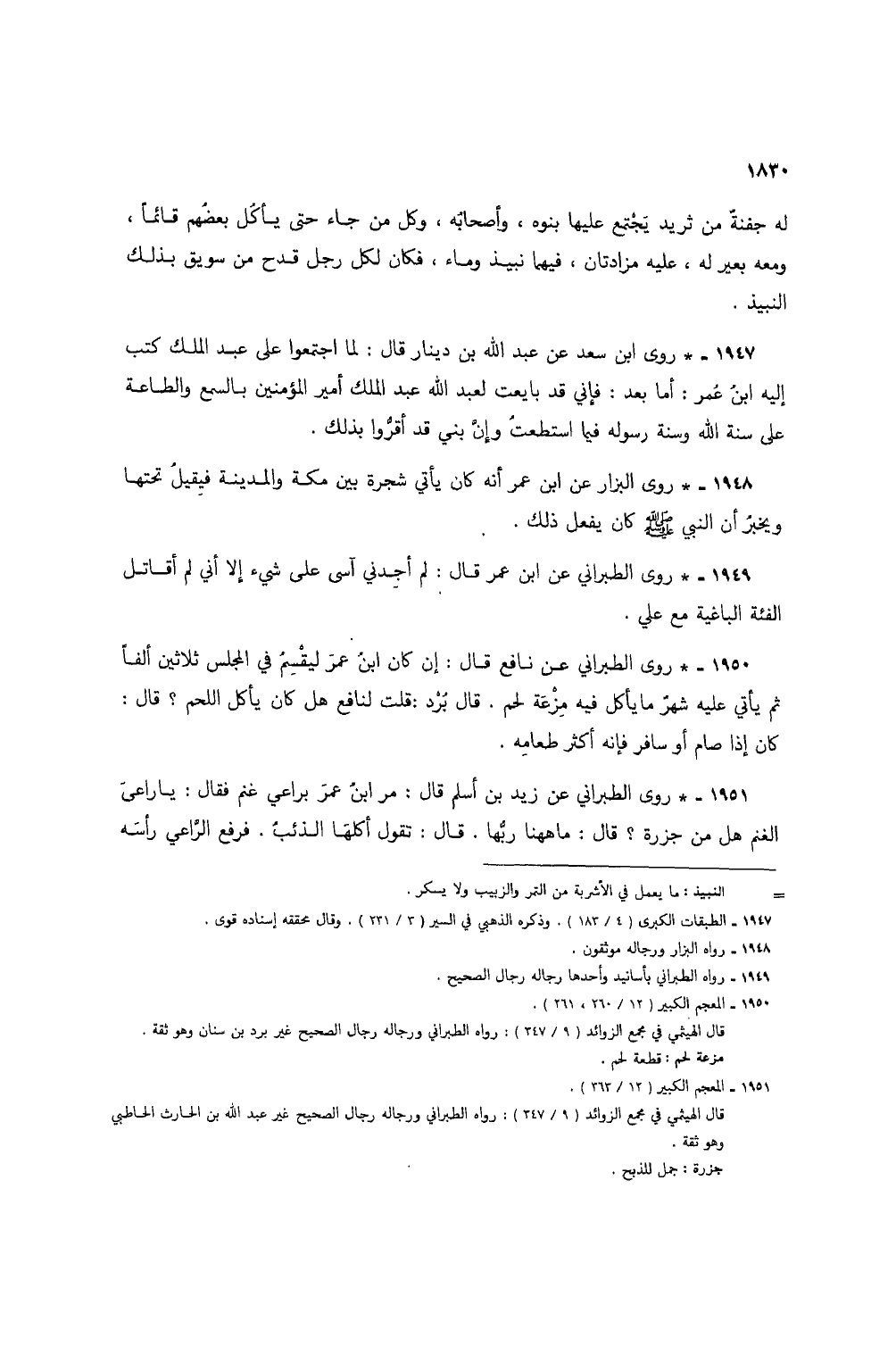 1950 - * روى الطبراني عن نافع قال: إن كان ابن عمر ليقسم في المجلس ثلاثين ألفاً ثم يأتي عليه شهر ما يأكل فيه مزعة لحم. قال برد: قلت لنافع هل كان يأكل اللحم؟ قال: كان إذا صام أو سافر فإنه أكثر طعامه.