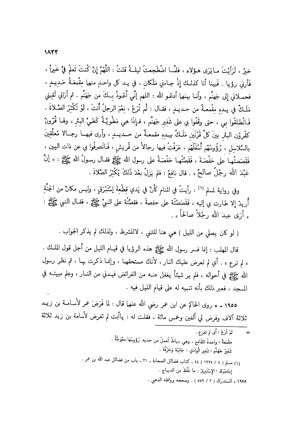 خير، لرأيت ما يرى هؤلاء، فلما اضطجعت ليلة قلت: اللهم إن كنت تعلم في خيرًا، فأرني رؤيا. فبينا أنا كذلك إذ جاءني ملكان، في يد كل واحدٍ منهما مقمعة حديد، فحملاني إلى جهنم، وأنا بينهما أدعو الله: اللهم إني أعوذ بك من جهنم، ثم أراني لقيني ملك في يده مقمعة من حديدٍ، فقال: لم ترع، نعم الرجل أنت، لو تكثر الصلاة. فانطلقوا بي، حتى وقفوا بي على شفير جهنم، فإذا هي مطوية كطي البئر، ولها قرون كقرون البئر بين كل قرنين ملك بيده مقمعة من حديد، وأرى فيها رجالاً معلقين بالسلاسل، رؤوسهم أسفلهم، عرفت فيها رجالاً من قريش، فانصرفوا بي عن ذات اليمين، فقصصتها على حفصة، فقصتها حفصة على رسول الله صلى الله عليه وسلم فقال رسول الله صلى الله عليه وسلم: "إن عبد الله رجل صالح". قال نافع: فلم يزل بعد ذلك يكثر الصلاة.