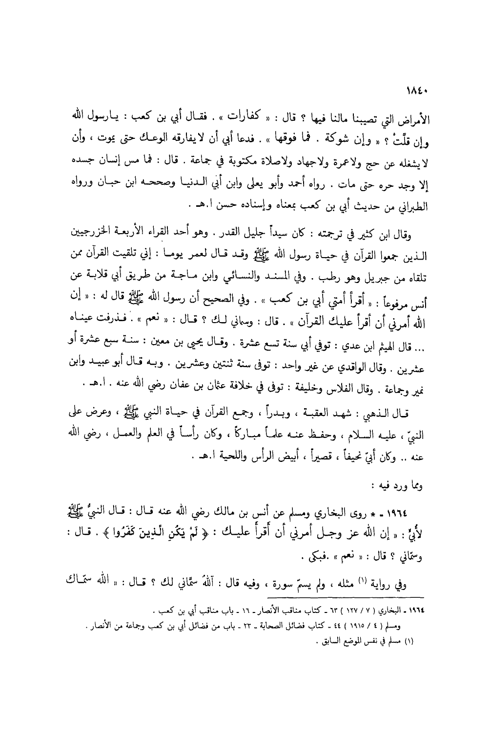 1964 - * روى البخاري ومسلم عن أنس بن مالك رضي الله عنه قال: قال النبي صلى الله عليه وسلم لأبي: "إن الله عز وجل أمرني أن أقرأ عليك: {لَمْ يَكُنِ الَّذِينَ كَفَرُوا}. قال: وسماني؟ قال: "نعم" فبكى.