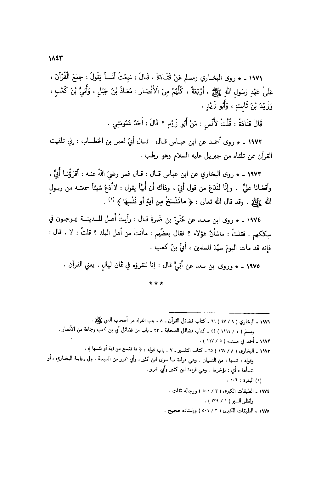 1973 - * روى البخاري عن ابن عباس قال: قال عمر رضي الله عنه: أقرؤنا أبي، وأقضانا علي. وإنا لندع من قول أبي، وذاك أن أبيًا يقول: لا أدع شيئًا سمعته من رسول الله صلى الله عليه وسلم. وقد قال الله تعالى: {مَا نَنْسَخْ مِنْ آيَةٍ أَوْ نُنْسِهَا} (1).