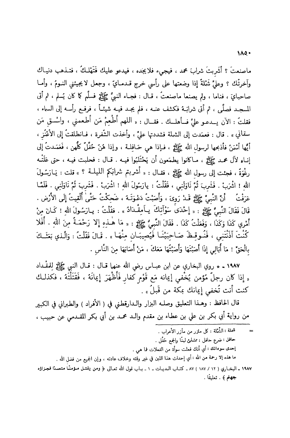 ما صنعت؟ أشربت شراب محمد، فيجيء فلا يجده، فيدعو عليك فتهلك، فتذهب دنياك وآخرتك؟ وعلي شملة إذا وضعتها على رأسي خرج قدماي، وجعل لا يجيئني النوم، وأما صاحباي، فناما، ولم يصنعا ما صنعت، قال: فجاء النبي صلى الله عليه وسلم فسلم كما كان يسلم، ثم أتى المسجد فصلى، ثم أتى شرابه فكشف عنه، فلم يجد فيه شيئًا، فرفع رأسه إلى السماء، فقلت: الآن يدعو علي فأهلك. فقال: "اللهم أطعم من أطعمني، واسسق من سقاني". قال: فعمدت إلى الشملة فشددتها علي، وأخذت الشفرة، فانطلقت إلى الأعنز، أيها أسمن فأذبحها لرسول الله صلى الله عليه وسلم، فإذا هي حافلة، وإذا هن حفل كلهن، فعمدت إلى إناء لآل محمد صلى الله عليه وسلم، ما كانوا يطمعون أن يحتلبوا فيه. قال: فحلبت فيه، حتى علته رغوة، فجئت إلى رسول الله صلى الله عليه وسلم، فقال: "أشربتم شرابكم الليلة؟ " قلت: يا رسول الله! اشرب. فشرب ثم ناولني، فقلت: يا رسول الله! اشرب. فشرب ثم ناولني. فلما عرفت أن النبي صلى الله عليه وسلم قد روى، وأصبت دعوته، ضحكت حتى ألقيت إلى الأرض. قال فقال النبي صلى الله عليه وسلم: "إحدى سوآتك يا مقداد". فقلت: يا رسول الله! كان من أمري كذا وكذا، وفعلت كذا. فقال النبي صلى الله عليه وسلم: "ما هذه إلا رحمة من الله. أفلا كنت آذنتني، فنوقظ صاحبينا فيصيبان منها". قال فقلت: والذي بعثك بالحق! ما أبالي إذا أصبتها وأصبتها معك، من أصابها من الناس.