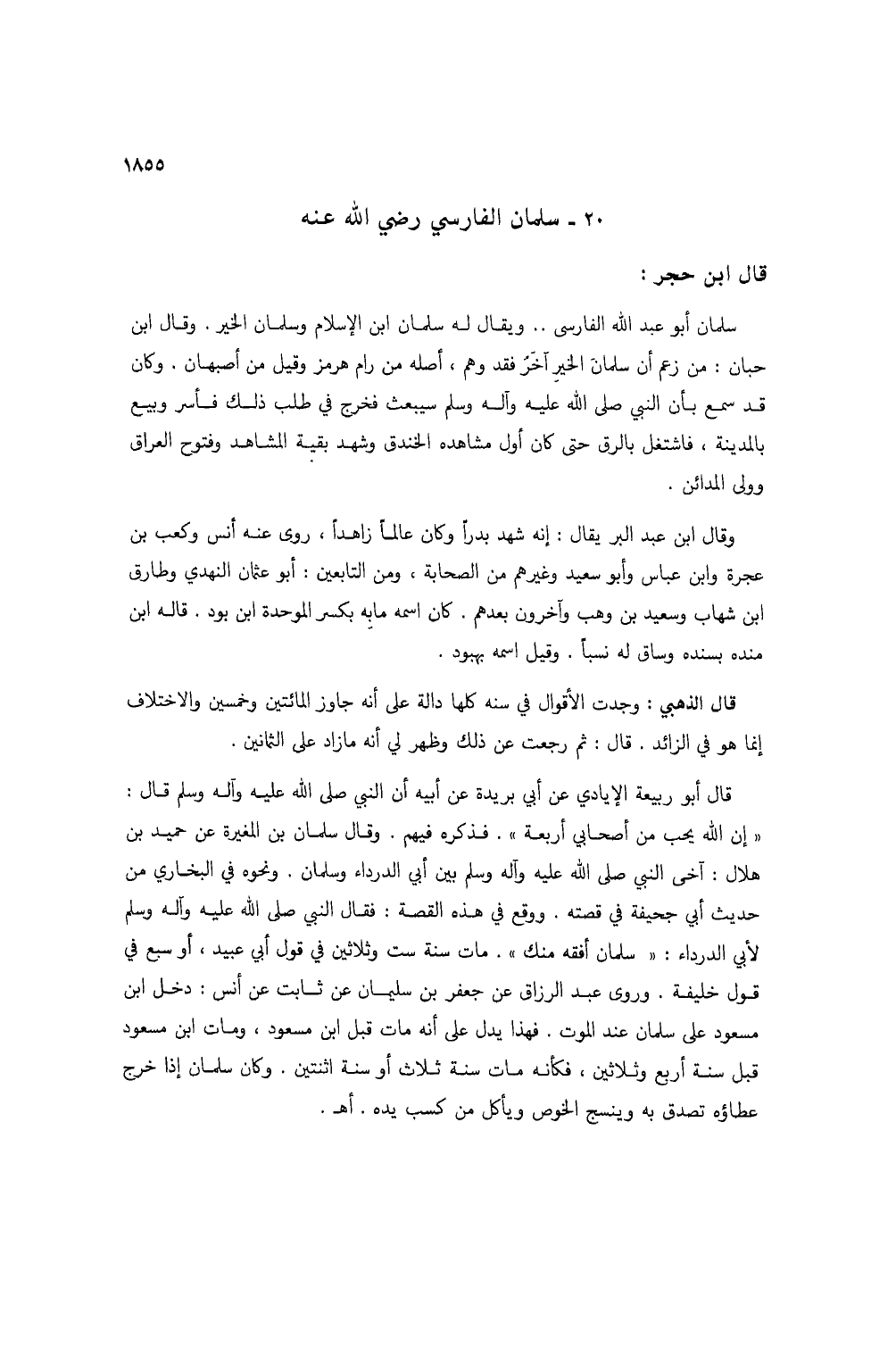 سلمان أبو عبد الله الفارسي .. ويقال له سلمان ابن الإسلام وسلمان الخير. وقال ابن حبان: من زعم أن سلمان الخير آخر فقد وهم، أصله من رام هرمز وقيل من أصبهان. وكان قد سمع بأن النبي صلى الله عليه وآله وسلم سيبعث فخرج في طلب ذلك فأسر وبيع بالمدينة، فاشتغل بالرق حتى كان أول مشاهده الخندق وشهد بقية المشاهد وفتوح العراق وولى المدائن.