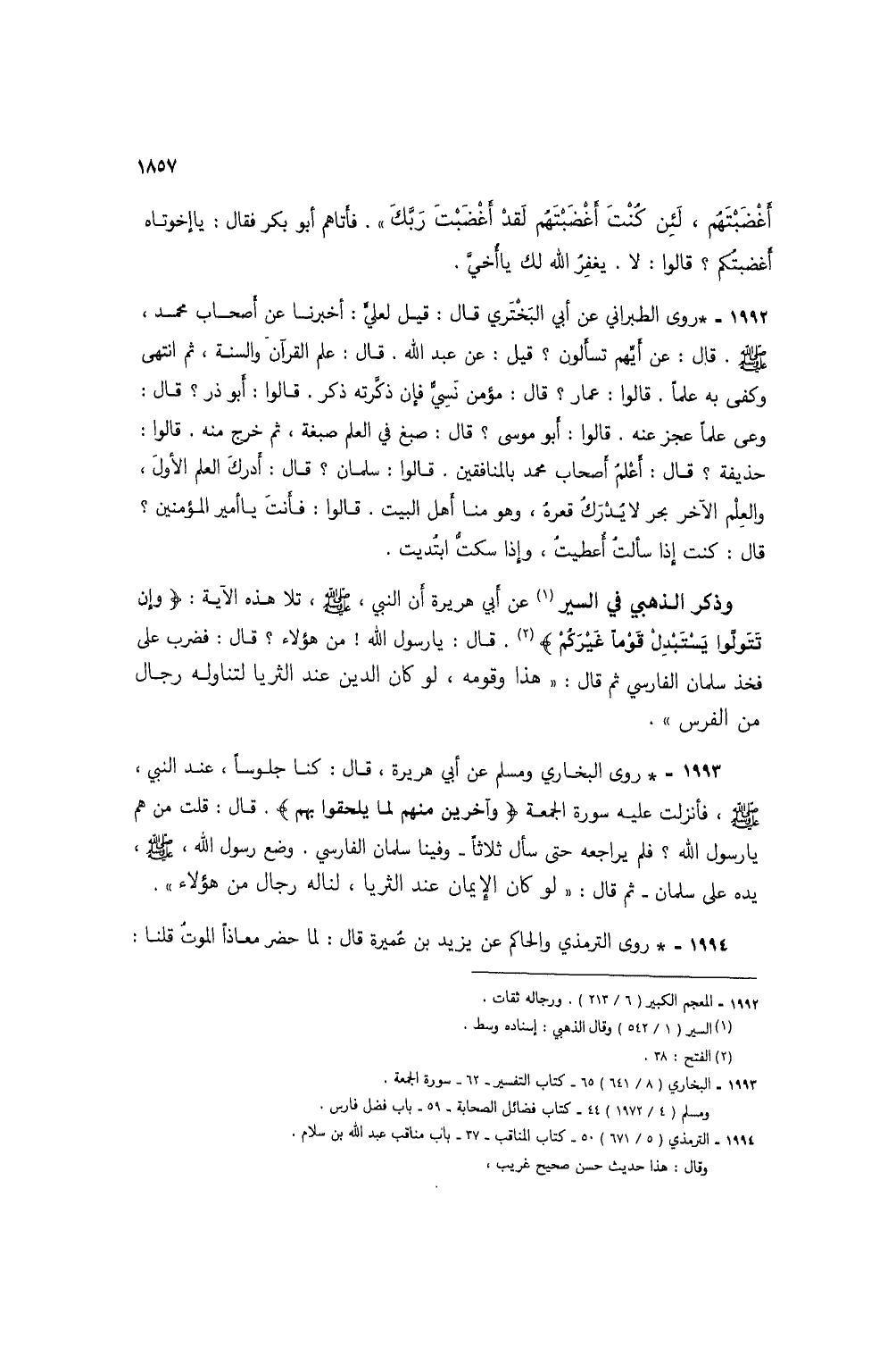 1993 - * روى البخاري ومسلم عن أبي هريرة، قال: كنا جلوسًا، عند النبي، صلى الله عليه وسلم، فأنزلت عليه سورة الجمعة {وَآخَرِينَ مِنْهُمْ لَمَّا يَلْحَقُوا بِهِمْ}. قال: قلت من هم يا رسول الله؟ فلم يراجعه حتى سأل ثلاثًا -وفينا سلمان الفارسي. وضع رسول الله، صلى الله عليه وسلم، يده على سلمان- ثم قال: "لو كان الإيمان عند الثريا، لناله رجال من هؤلاء".