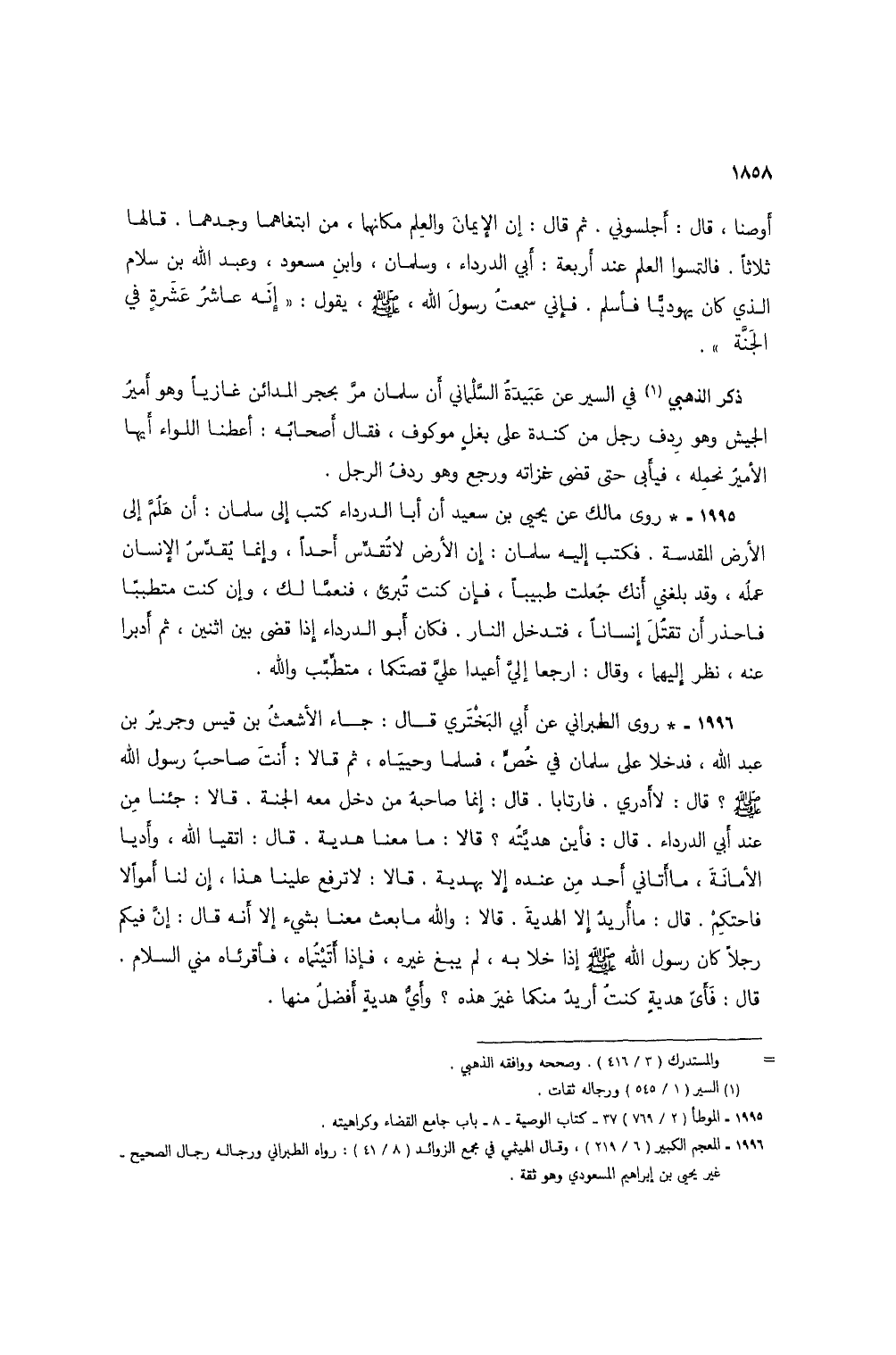 1996 - * روى الطبراني عن أبي البختري قال: جاء الأشعث بن قيس وجرير بن عبد الله، فدخلا على سلمان في خص، فسلما وحيياه، ثم قالا: أنت صاحب رسول الله صلى الله عليه وسلم؟ قال: لا أدري. فارتابا. قال: إنما صاحب من دخل معه الجنة. قالا: جئنا من عند أبي الدارداء. قال: فأين هديته؟ قالا: ما معنا هدية. قال: اتقيا الله، وأديا الأمانة، ما أتاني أحد من عندي إلا بهدية. قالا: لا ترفع علينا هذا، إن لنا أموالاً فاحتكم. قال: ما أريد إلا الهدية. قالا: والله ما بعث معنا بشيء إلا أنه قال: إن فيكم رجلاً كان رسول الله صلى الله عليه وسلم إذا خلا به، لم يبغ غيره، فإذا أتيتماه، فأقرناه مني السلام. قال: فأي هدية كنت أريد منكما غير هذه؟ وأي هديةٍ أفضل منها.