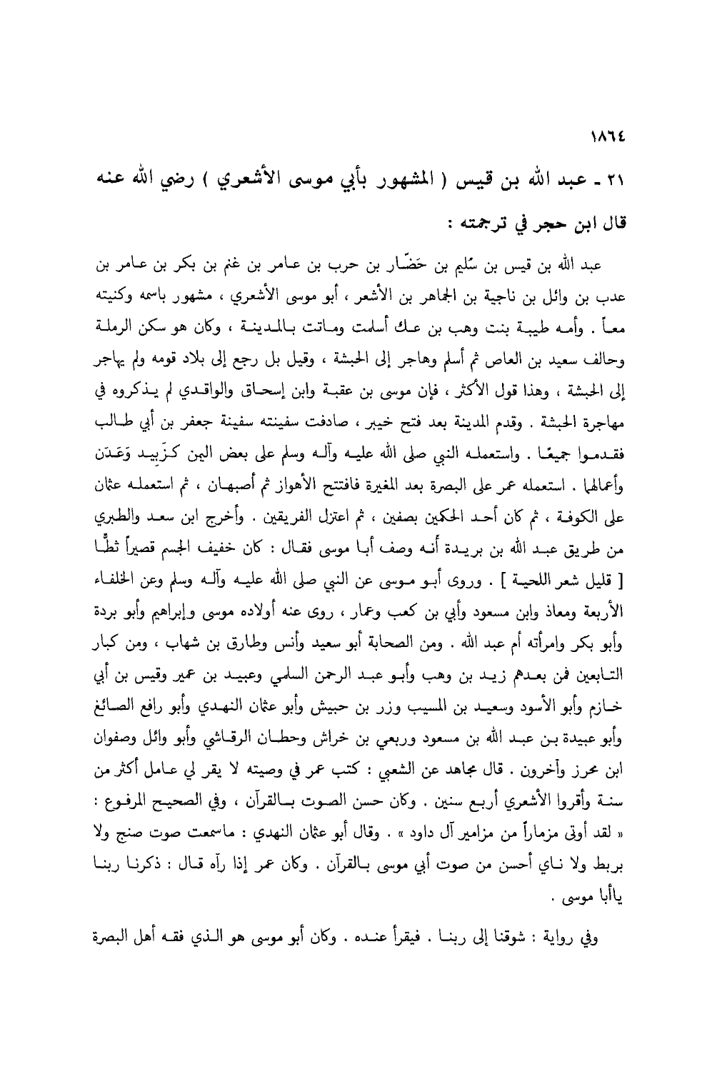 عبد الله بن قيس بن سليم بن حضار بن حرب بن عامر بن غنم بن بكر بن عامر بن عدب بن وائل بن ناجية بن الجماهر بن الأشعر، أبو موسى الأشعري، مشهور باسمه وكنيته معاً. وأمه طيبة بنت وهب بن عك أسلمت وماتت بالمدينة، وكان هو سكن الرملة وحالف سعيد بن العاص ثم أسلم وهاجر إلى الحبشة، وقيل بل رجع إلى بلاد قومه ولم يهاجر إلى الحبشة، وهذا قول الأكثر، فإن موسى بن عقبة وابن إسحاق والواقدي لم يذكروه في مهاجرة الحبشة. وقدم المدينة بعد فتح خيبر، صادفت سفينته سفينة جعفر بن أبي طالب فقدموا جمعاً. واستعمله النبي صلى الله عليه وسلم على بعض اليمن كزبيد وعدن وأعمالهما. استعمله عمر على البصرة بعد المغيرة فافتتح الأهواز ثم أصبهان، ثم استعمله عثمان على الكوفة، ثم كان أحد الحكمين بصفين، ثم اعتزل الفريقين. وأخرج ابن سعد والطبري من طريق عبد الله بن بريدة أنه وصف أبا موسى فقال: كان خفيف الجسم قصيراً ثطا [قليل شعر اللحية]. وروى أبو موسى عن النبي صلى الله عليه وآله وسلم وعن الخلفاء الأربعة ومعاذ وابن مسعود وأبى بن كعب وعمار، روى عنه أولاده موسى وإبراهيم وأبو بردة وأبو بكر وامرأته أم عبد الله. ومن الصحابة أبو سعيد وأنس وطارق بن شهاب، ومن كبار التابعين فمن بعدهم زيد بن وهب وأبو عبد الرحمن السلمي وعبيد بن عمير وقيس بن أبي خازم وأبو الأسود وسعيد بن المسيب وزر بن حبيش وأبو عثمان النهدي وأبو رافع الصائغ وأبو عبيدة بن عبد الله بن مسعود وربعي بن خراش وحطان الرقاشي وأبو وائل وصفوان ابن محرز وآخرون. قال مجاهد عن الشعبي: كتب عمر في وصيته لا يقر لي عامل أكثر من سنة وأقروا الأشعري أربع سنين. وكان حسن الصوت بالقرآن، وفي الصحيح المرفوع: "لقد أوتى مزماراً من مزامير آل داود". وقال أبو عثمان النهدي: ما سمعت صوت صنج ولا ناي أحسن من صوت أبي موسى بالقرآن. وكان عمر إذا رآه قال: ذكرنا ربنا يا أبا موسى.