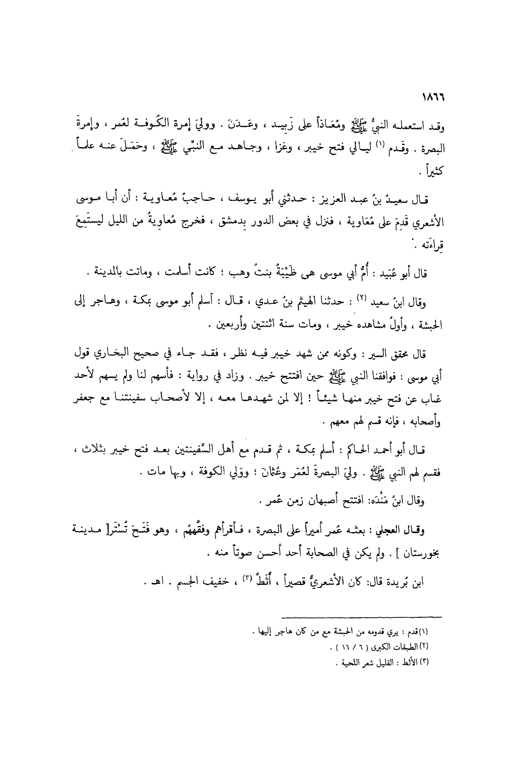 وقال ابن سعيد (2): حدثنا الهيثم بن عدي، قال: أسلم أبو موسى بمكة، وهاجر إلى الحبشة، وأول مشاهده خيبر، ومات سنة اثنتين وأربعين.