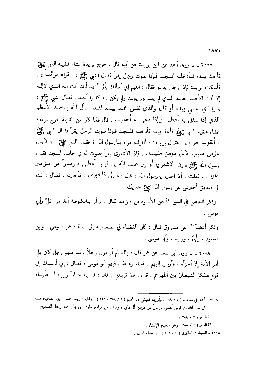 2007 - * روى أحمد عن ابن بريدة عن أبيه قال: خرج بريدة عشاء فلقيه النبي صلى الله عليه وسلم فأخذ بيده فأدخله المسجد فإذا صوت رجل يقرأ فقال النبي صلى الله عليه وسلم: "تراه مرائياً". فأسكت بريدة فإذا رجل يدعو فقال: اللهم إني أسألك بأني أشهد أنك أنت الله الذي لا إله إلا أنت الأحد الصمد الذي لم يلد ولم يولد ولم يكن له كفواً أحد. فقال النبي صلى الله عليه وسلم: "والذي نفسي بيده أو قال والذي نفس محمد بيده لقد سأل الله باسمه الأعظم الذي إذا سئل به أعطى وإذا دعي به أجاب". قال فلما كان من القابلة خرج بريدة عشاء فلقيه النبي صلى الله عليه وسلم فأخذ بيده فأدخله المسجد فإذا صوت الرجل يقرأ فقال النبي صلى الله عليه وسلم "أتقوله مراء". فقال بيدة: أتقوله مراء يا رسول الله؟ فقال النبي صلى الله عليه وسلم: "لابل مؤمن منيب لابل مؤمن منيب". فإذا الأشعري يقرأ بصوت له في جانب المسجد فقال رسول الله صلى الله عليه وسلم "إن الأشعري أو إن عبد الله بن قيس أعطي مزماراً من مزامير داود". فقلت: ألا أخبره يا رسول الله؟ قال: "بلى فأخبره". فأخبرته. فقال: أنت لي صديق أخبرتني عن رسول الله صلى الله عليه وسلم بحديث.