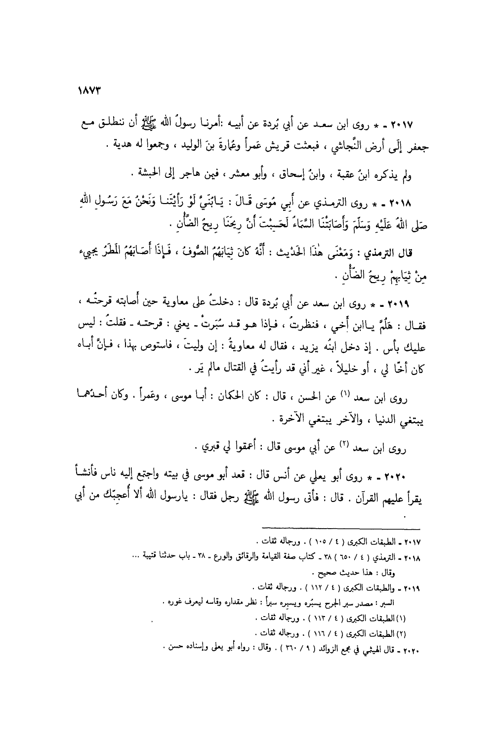 2020 - * روى أبو يعلي عن أنس قال: قعد أبو موسى في بيته واجتمع إليه ناس فأنشأ يقرأ عليهم القرآن. قال: فأتى رسول الله صلى الله عليه وسلم رجل فقال: يا رسول الله ألا أعجبك من أبي