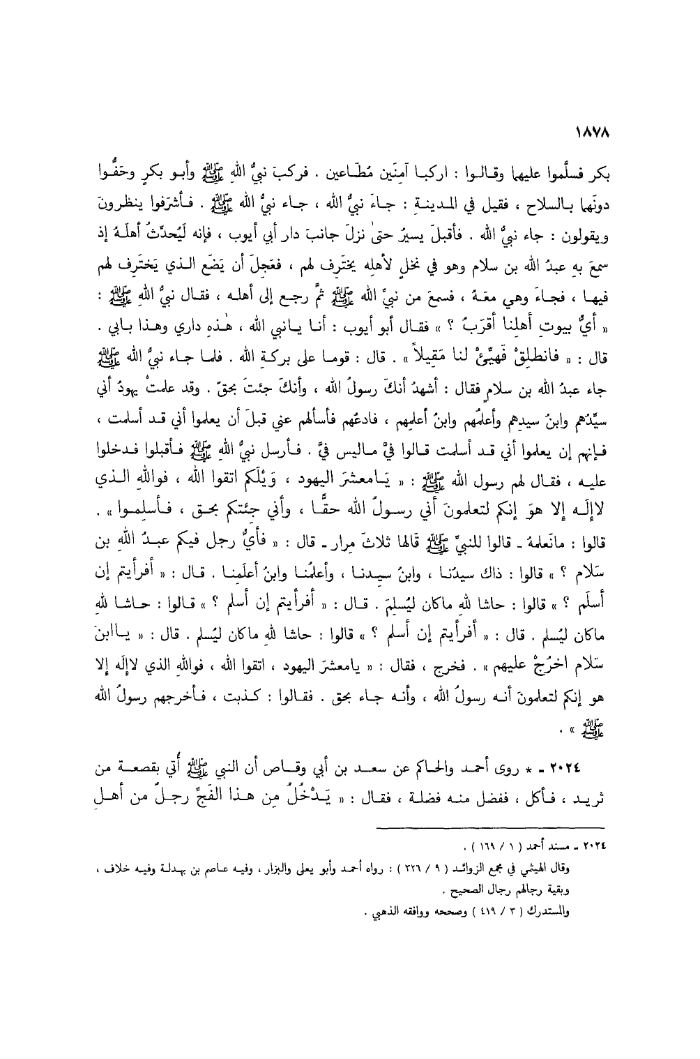 بكر فسلموا عليهما وقالوا: اركبا آمنين مطاعين. فركب نبي الله صلى الله عليه وسلم وأبو بكر وحفوا دونهما بالسلاح، فقيل في المدينة: جاء نبي الله، جاء نبي الله صلى الله عليه وسلم. فأشرفوا ينظرون ويقولون: جاء نبي الله. فأقبل يسير حتى نزل جانب دار أبي أيوب، فإنه ليحدث أهله إذ سمع به عبد الله بن سلام وهو في نخل لأهله يخترف لهم، فعجل أن يضع الذي يخترف لهم فيها، فجاء وهي معه، فسمع من نبي الله صلى الله عليه وسلم ثم رجع إلى أهله، فقال نبي الله صلى الله عليه وسلم: "أي بيوت أهلنا أقرب؟ " فقال أبو أيوب: أنا يا نبي الله، هذه داري وهذا بابي. قال: "فانطلق فهيئ لنا مقيلاً". قال: قوما على بركة الله. فلما جاء نبي الله صلى الله عليه وسلم جاء عبد الله بن سلام فقال: أشهد أنك رسول الله، وأنك جئت بحق. وقد علمت يهود أني سيدهم وابن سيدهم وأعلمهم وابن أعلمهم، فادعهم فأسألهم عني قبل أن يعلموا أني قد أسلمت، فإنهم إن يعلموا أني قد أسلمت قالوا في ما ليس في. فأرسل نبي الله صلى الله عليه وسلم فأقبلوا فدخلوا عليه، فقال لهم رسول الله صلى الله عليه وسلم: "يا معشر اليهود، ويلكم اتقوا الله، فوالله الذي لا إله إلا هو إنكم لتعلمون أني رسول الله حقاً، وأني جئتكم بحق، فأسلموا". قالوا: ما نعلمه -قالوا للنبي صلى الله عليه وسلم قالها ثلاث مرار -قال: "فأي رجل فيكم عبد الله بن سلام؟ " قالوا: ذاك سيدنا، وابن سيدنا، وأعلمنا وابن أعلمنا. قال: "أفرأيتم إن أسلم؟ " قالوا: حاشا لله ما كان ليسلم. قال: "أفرأيتم إن أسلم؟ " قالوا: حاشا لله ما كان ليسلم. قال: "أفرأيتم إن أسلم؟ " قالوا: حاشا له ما كان ليسلم. قال: "يا ابن سلام اخرج عليهم". فخرج، فقال: "يا معشر اليهود، اتقوا الله، فوالله الذي لا إله إلا هو إنكم لتعلمون أنه رسول الله، وأنه جاء بحق. فقالوا: كذبت، فأخرجهم رسول الله صلى الله عليه وسلم".