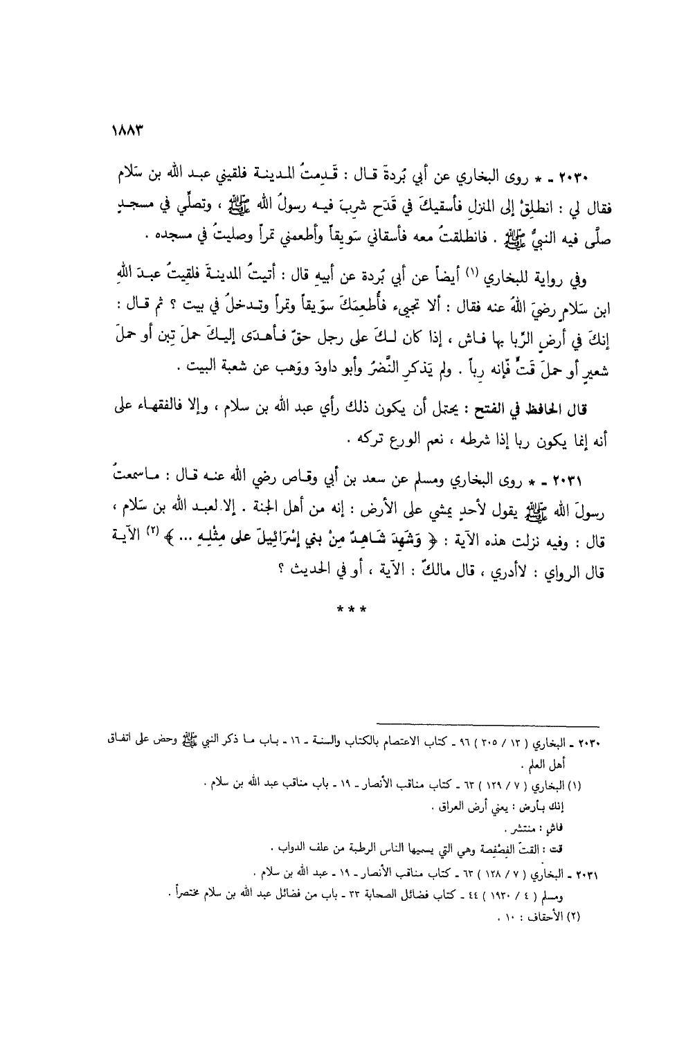 2031 - * روى البخاري ومسلم عن سعد بن أبي وقاص رضي الله عنه قال: ما سمعت رسول الله صلى الله عليه وسلم يقول لأحدٍ يمشي على الأرض: إنه من أهل الجنة. إلا لعبد الله بن سلام، قال: وفيه نزلت هذه الآية: {وَشَهِدَ شَاهِدٌ مِنْ بَنِي إِسْرَائِيلَ عَلَى مِثْلِهِ ...} الآية (4). قال الراوي: لا أدري، قال مالك: الآية، أو في الحديث؟