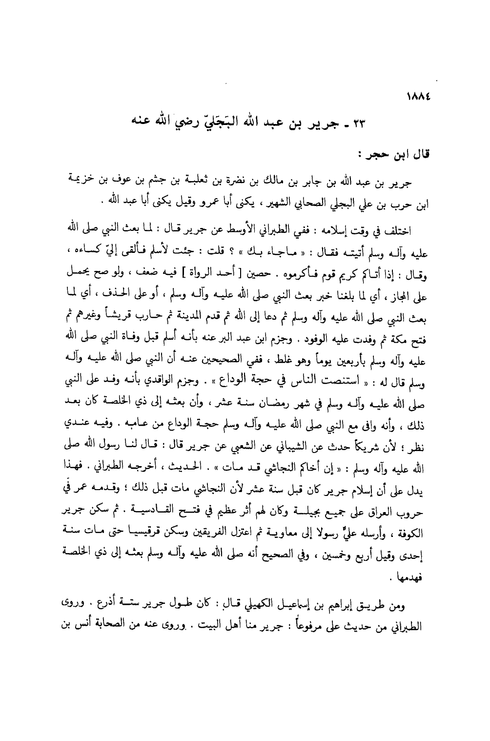 اختلف في وقت إسلامه: ففي الطبراني الأوسط عن جرير قال: لما بعث النبي صلى الله عليه وآله وسلم أتيته فقال: "ما جاء بك"؟ قلت: جئت لأسلم فألقى إلي كساءه، وقال: إذا أتاكم كريم قوم فأكرموه. حصين [أحد الرواة] فيه ضعف، ولو صح يحمل على المجاز، أي لما بلغنا خبر بعث النبي صلى الله عليه وآله وسلم، أو على الحذف، أي لما بعث النبي صلى الله عليه وآله وسلم ثم دعا إلى الله ثم قدم المدينة ثم حارب قريشًا وغيرهم ثم فتح مكة ثم وفدت عليه الوفود. وجزم ابن عبد البر عنه بأنه أسلم قبل وفاة النبي صلى الله عليه وآله وسلم بأربعين يومًا وهو غلط، ففي الصحيحين عنه أن النبي صلى الله عليه وآله وسلم قال له: "استنصت الناس في حجة الوداع". وجزم الواقدي بأنه وفد على النبي صلى الله عليه وآله وسلم في شهر رمضان سنة عشر، وأن بعثه إلى ذي الخلصة كان بعد ذلك، وأنه وافى مع النبي صلى الله عليه وآله وسلم حجة الوداع من عامه. وفيه عندي نظر؛ لأن شريكًا حدث عن الشيباني عن الشعبي عن جرير قال: قال لنا رسول الله صلى الله عليه وآله وسلم: "إن أخاكم النجاشي قد مات". الحديث، أخرجه الطبراني. فهذا يدل على أن إسلام جرير كان قبل سنة عشر لأن النجاشي مات قبل ذلك؛ وقدمه عمر في حروب العراق على جميع بجيلة وكان لهم أثر عظيم في فتح القادسية. ثم سكن جرير الكوفة، وأرسله علي رسولا إلى معاوية ثم اعتزل الفريقين وسكن قرقيسيا حتى مات سنة إحدى وقيل أربع وخمسين، وفي الصحيح أنه صلى الله عليه وآله وسلم بعثه إلى ذي الخلصة فهدمها.