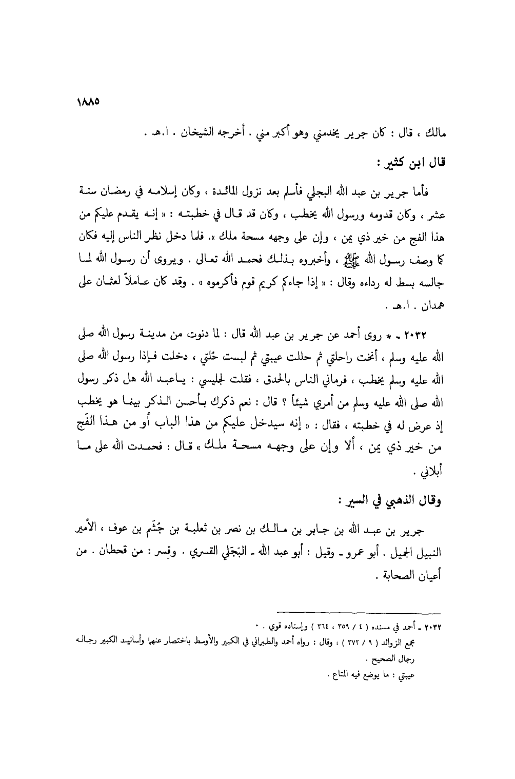 2032 - * روى أحمد عن جرير بن عبد الله قال: لما دنوت من مدينة رسول الله صلى الله عليه وسلم، أنخت راحلتي ثم حللت عيبتي ثم لبست حلتي، دخلت فإذا رسول الله صلى الله عليه وسلم يخطب، فرماني الناس بالحدق، فقلت لجليسي: يا عبد الله هل ذكر رسول الله صلى الله عليه وسلم من أمري شيئًا؟ قال: نعم ذكرك بأحسن الذكر بينما هو يخطب إذ عرض له في خطبته، فقال: "إنه سيدخل عليكم من هذا الباب أو من هذا الفج من خير ذي يمن، ألا وإن على وجهه مسحة ملك" قال: فحمدت الله على ما أبلاني.