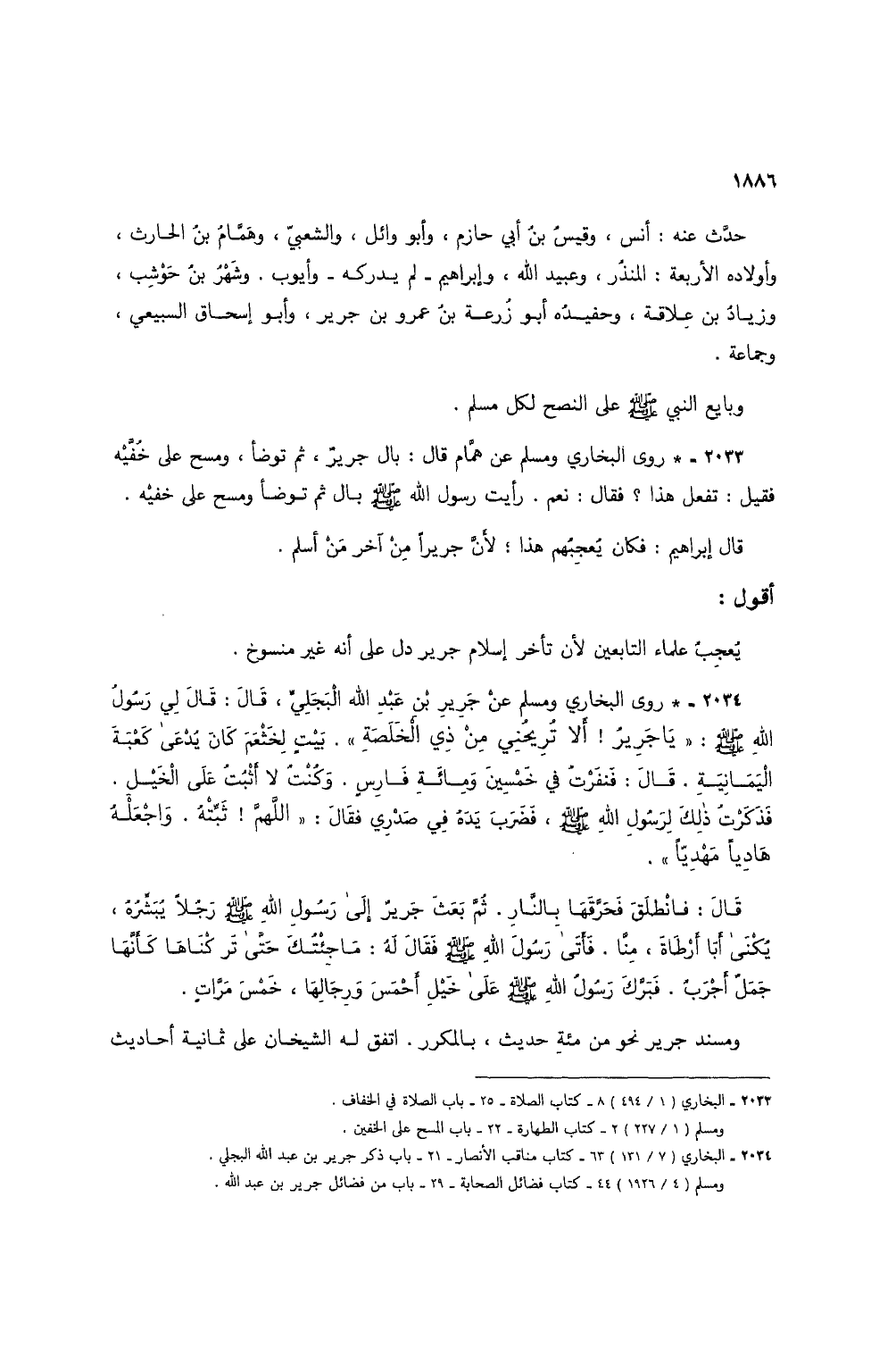 2033 - * روى البخاري ومسلم عن همام قال: بال جرير، ثم توضأ، ومسح على خفيه فقيل: تفعل هذا؟ فقال: نعم. رأيت رسول الله صلى الله عليه وسلم بال ثم توضأ ومسح على خفيه.