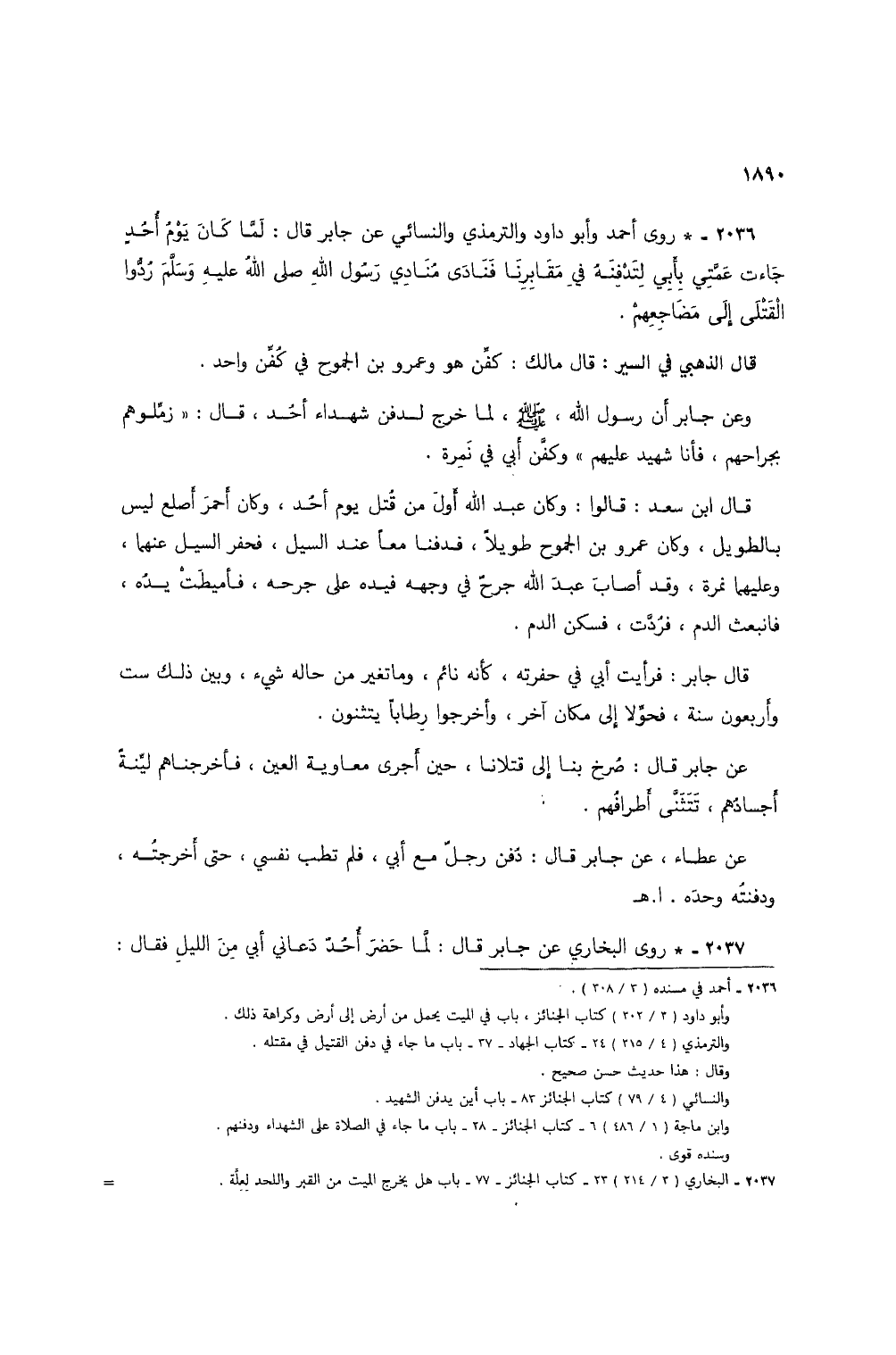 2036 - * روى أحمد وأبو داود والترمذي والنسائي عن جابر قال: لما كان يوم أحد جاءت عمتي بأبي لتدفنه في مقابرنا فنادى منادي رسول الله صلى الله عليه وسلم ردوا القتلى إلى مضاجعهم.