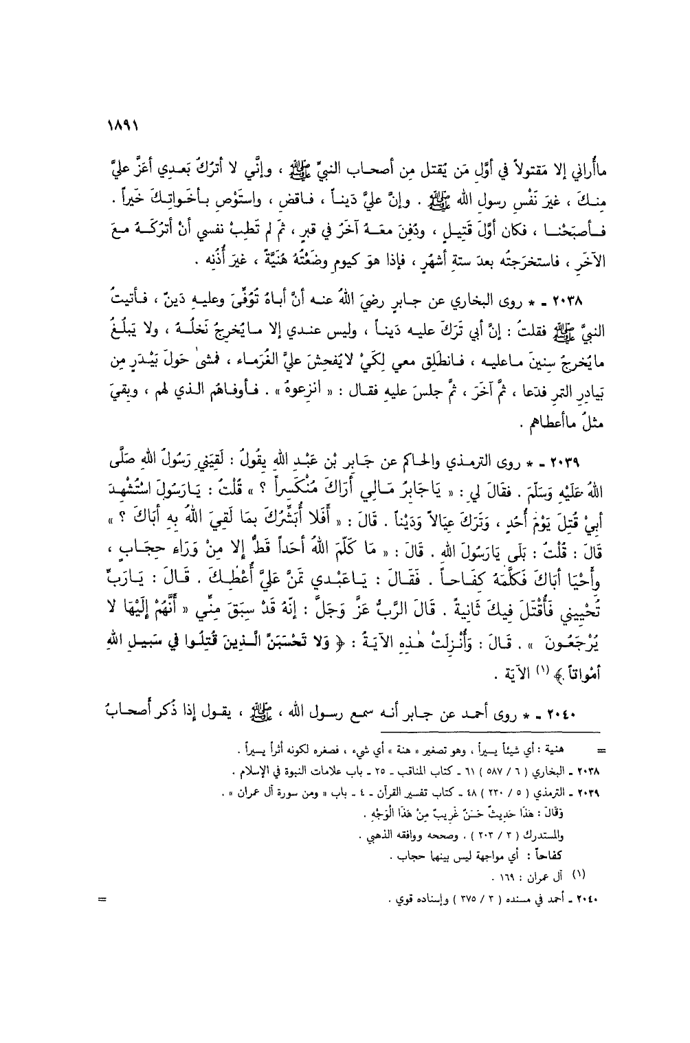 2039 - * روى الترمذي والحاكم عن جابر بن عبد الله يقول: لقيني رسول الله صلى الله عليه وسلم. فقال لي: "يا جابر مالي أراك منكسرًا؟ " قلت: يا رسول استشهد أبي قتل يوم أحدٍن وترك عيالاً ودينًا. قال: "أفلا أبشرك بما لقي الله به أباك؟ قال: قلت: بلى يا رسول الله. قال: "ما كلم الله أحدًا قط إلا من وراء حجاب، وأحيا أباك فكلمه كفاحًا. فقال: يا عبدي تمن علي أعطك. قال: يا رب تحييني فأقتل فيك ثانية. قال الرب عز وجل: إنه قد سبق مني "أنهم إليها لا يرجعون". قال: وأنزلت هذه الآية: {وَلَا تَحْسَبَنَّ الَّذِينَ قُتِلُوا فِي سَبِيلِ اللَّهِ أَمْوَاتًا} (3) الآية.