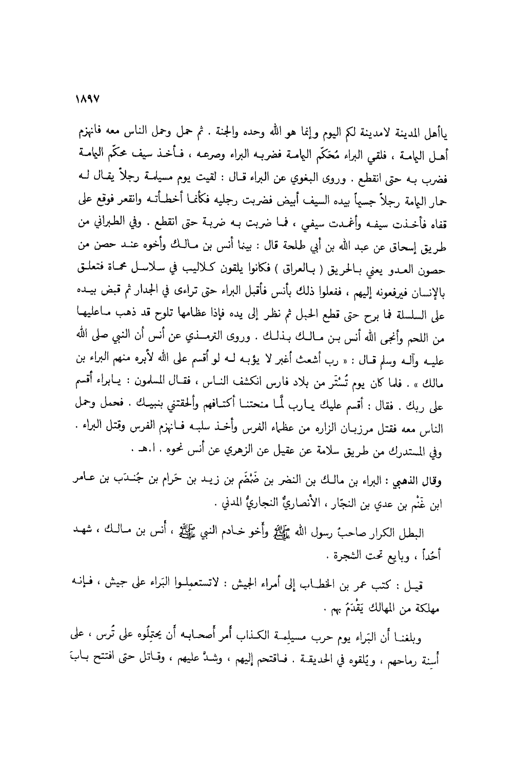 يا أهل المدينة لا مدينة لكم اليوم وإنما هو الله وحده والجنة. ثم حمل وحمل الناس معه فانهزم أهل اليمامة، فلقي البراء معكم اليمامة فضربه البراء وصرعه، فأخذ سيف محكم اليمامة فضرب به حتى انقطع. وروى البغوي عن البراء قال: لقيت يوم مسيلمة رجلاً يقال له حمار اليمامة رجلاً جسيمًا بيده السيف أبيض فضربت رجليه فكأنما أخطأته وانقعر فوقع على قفاه فأخذت سيفه وأغمدت سيفي، فما ضربت به ضربة حتى انقطع. وفي الطبراني من طريق إسحاق عن عبد الله بن أبي طلحة قال: بينما أنس بن مالك وأخوه عند حصن من حصون العدو يعني بالحريق (بالعراق) فكانوا يلقون كلاليب في سلاسل محماة فتعلق بالإنسان فيرفعونه إليهم، ففعلوا ذلك بأنس فأقبل البراء حتى تراءى في الجدار ثم قبض بيده على السلسلة فما برح حتى قطع الحبل ثم نظر إلى يده فإذا عظامها تلوح قد ذهب ما عليها من اللحم وأنجى الله أنس بن مالك بذلك. وروى الترمذي عن أنس أن النبي صلى الله عليه وآله وسلم قال: "رب أشعث أغبر لا يؤبه له لو أقسم على الله لأبره منهم البراء بن مالك". فلما كان يوم تستر من بلاد فارس انكشف الناس، فقال المسلمون: يا براء أقسم على ربك. فقال: أقسم عليك يا رب لما منحتنا أكتافهم وألحقتني بنبيك. فحمل وحمل الناس معه فقتل مرزبان الزاره من عظماء الفرس وأخذ سلبه فانهزم الفرس وقتل البراء. وفي المستدرك من طريق سلامة عن عقيل عن الزهري عن أنس نحوه. ا. هـ.