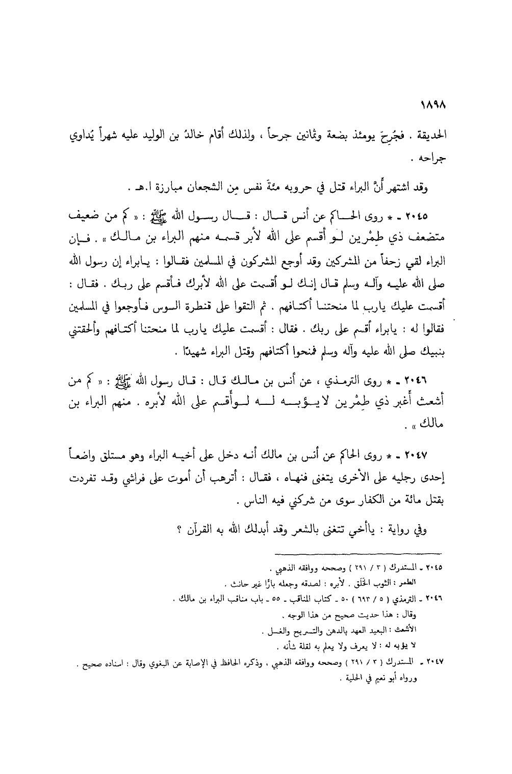 2047 - * روى الحاكم عن أنس بن مالك أنه دخل على أخيه البراء وهو مستلق واضعًا إحدى رجليه على الأخرى يتغنى فنهاه، فقال: أترهب أن أموت على فراشي وقد تفردت بقتل مائة من الكفار سوى من شركني فيه الناس.