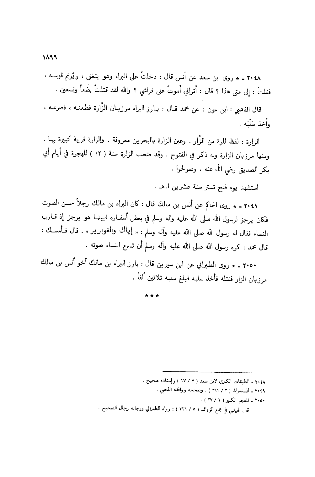 2050 - * روى الطبراني عن ابن سيرين قال: بارز البراء بن مالك أخو أنس بن مالك مرزبان الزار فقتله فأخذ سلبه فبلغ سلبه ثلاثين ألفًا.
