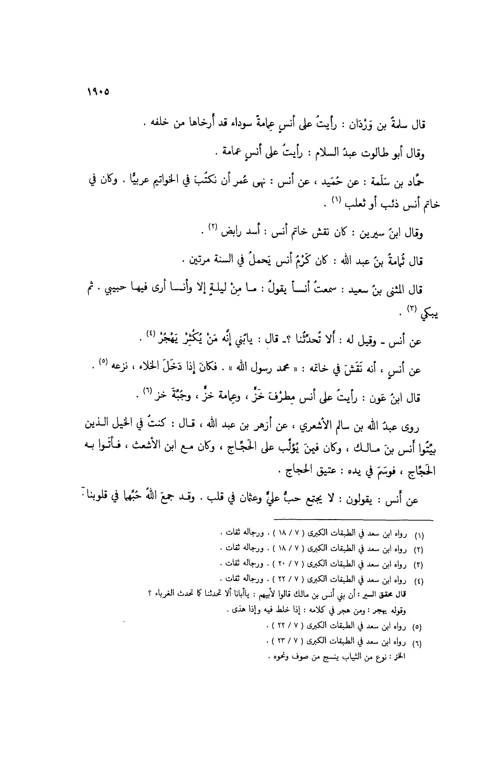 قال ابن عون: رأيت على أنس مطرف خز، وعمامة خز، وجبة خز (6).