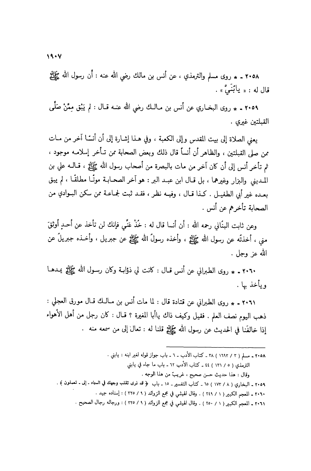 2059 - * روى البخاري عن أنس بن مالك رضي الله عنه قال: لم يبق ممن صلى القبلتين غيري.