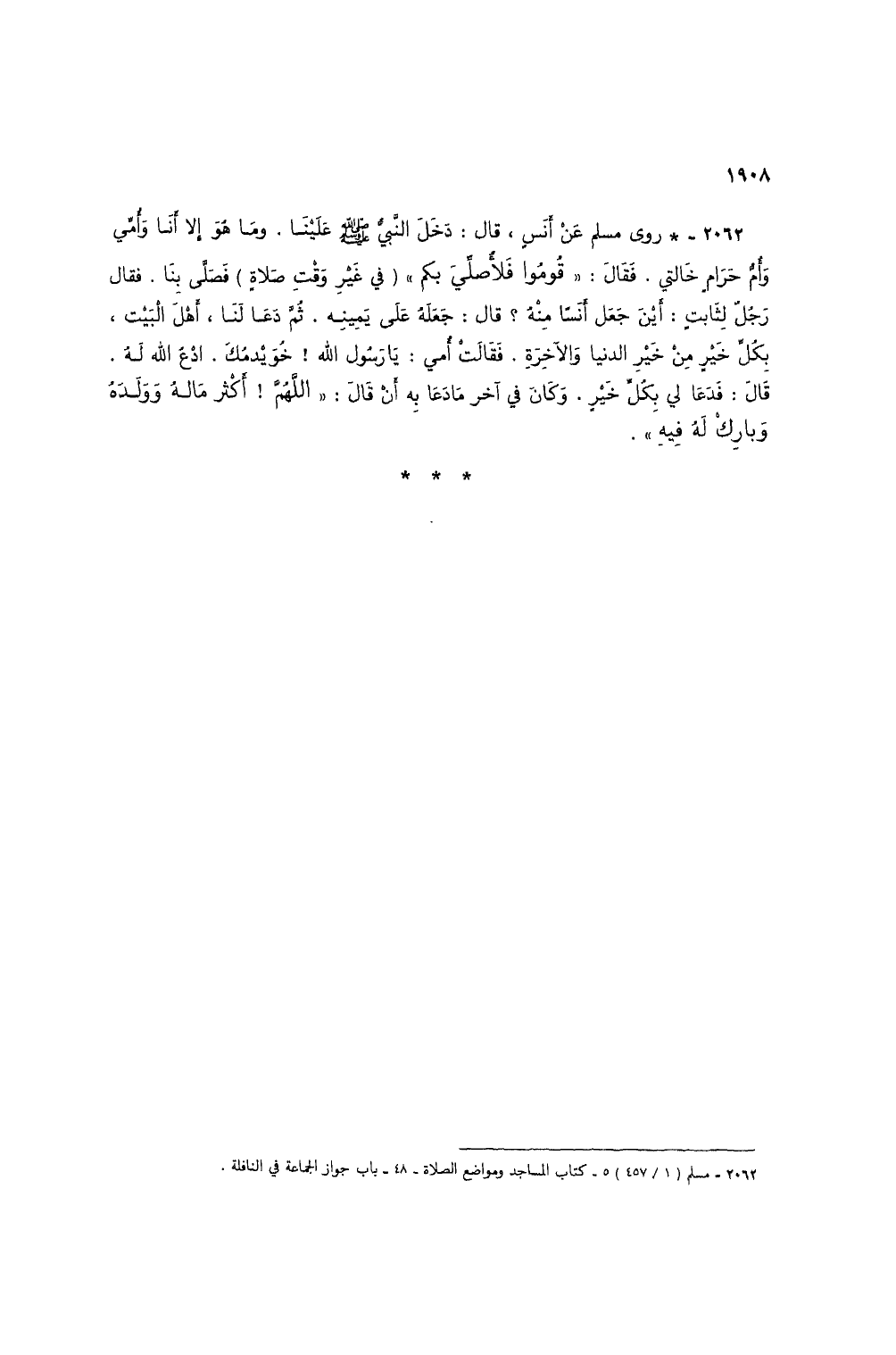 2062 - * روى مسلم عن أنس، قال: دخل النبي صلى الله عليه وسلم علينا. وما هو إلا أنا وأمي وأم حرام خالتي. فقال: "قوموا فلأصلي بكم" (في غير وقت صلاة) فصلى بنا. فقال رجل لثابت: أين جعل أنساً منه؟ قال: جعله على يمينه. ثم دعا لنا، أهل البيت، بكل خير من خير الدنيا والآخرة. فقالت أمي: يا رسول الله! خويدمك. ادع الله له. قال: فدعا لي بكل خير. وكان في آخر ما دعا به أن قال: "اللهم! أكثر ماله وولده وبارك له فيه".