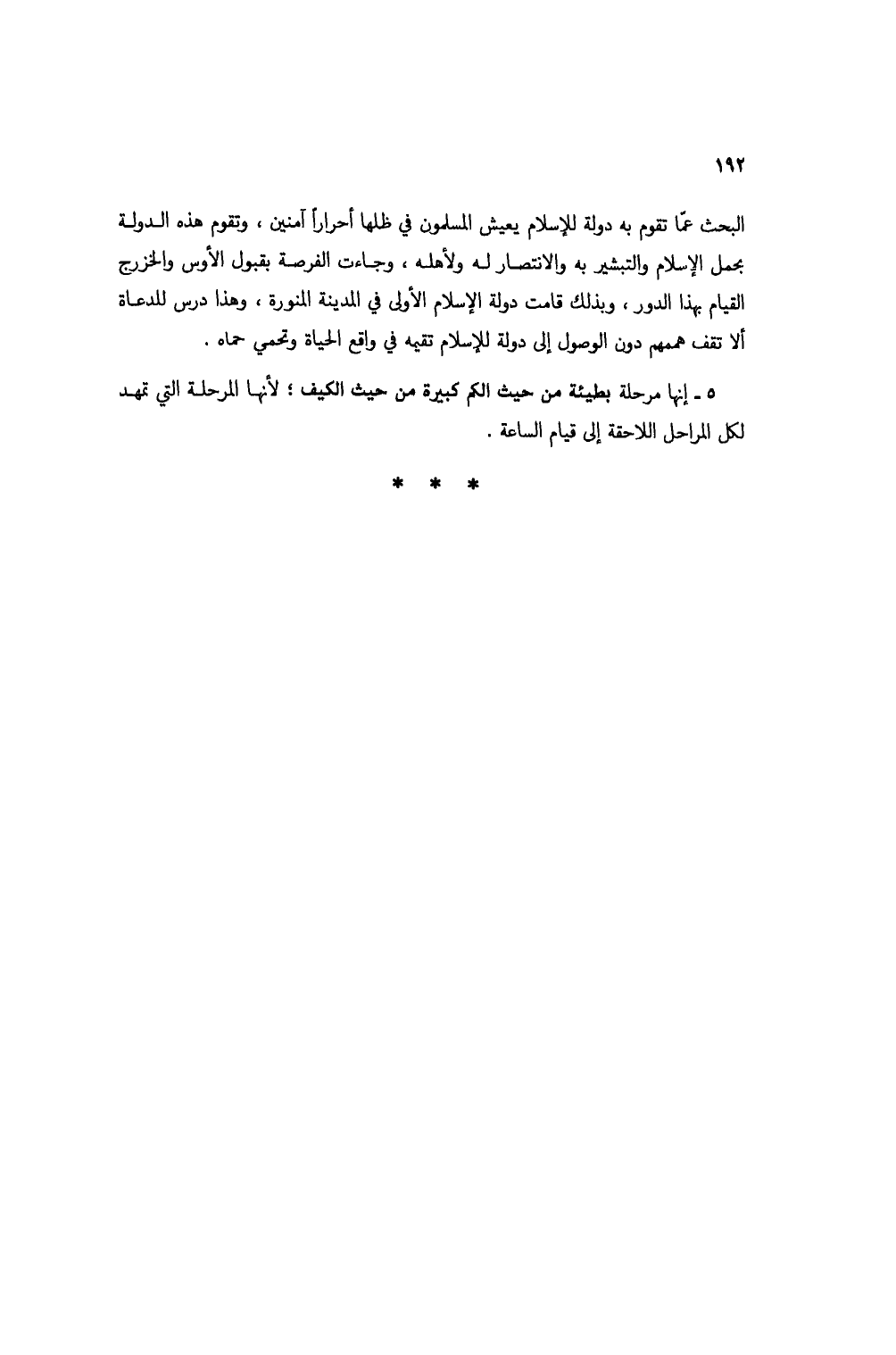 5 - إنها مرحلة بطيئة من حيث الكم كبيرة من حيث الكيف؛ لأنها المرحلة التي تمهد لكل المراحل اللاحقة إلى قيام الساعة.