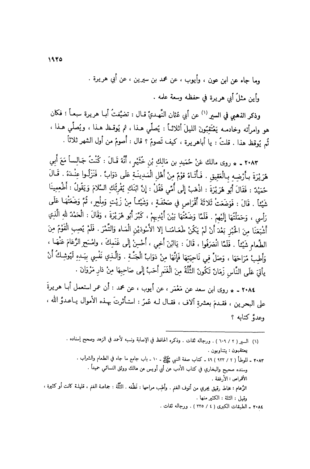 2083 - * روى مالك عن حميد بن مالك بن خثيمٍ، أنه قال: كنت جالسًا مع أبي هريرة بأرضه بالعقيق. فأتاه قوم من أهل المدينة على دواب. فنزلوا عنده. قال حميد: فقال أبو هريرة: اذهب إلى أمي فقل: إن ابنك يقرئك السلام ويقول: أطعمينا شيئًا. قال: فوضعت ثلاثة أقراص في صحفةٍ، وشيئًا من زيت وملحٍ، ثم وضعتها على رأسي، وحملتها إليهم. فلما وضعتها بين أيديهم، كبر أبو هريرة، وقال: الحمد لله الذي أشبعنا من الخبز بعد أن لم يكن طعامنا إلا الأسودين الماء والتمر. فلم يصب القوم من الطعام شيئًا. فلما انصرفوا، قال: يا ابن أخي، أحسن إلى غنمك، وامسح الرعام عنها، وأطب مراحها، وصل في ناحيتها فإنها من دواب الجنة. والذي نفسي بيده ليوشك أن يأتي على الناس زمان تكون الثلة من الغنم أحب إلى صاحبها من دار مروان.