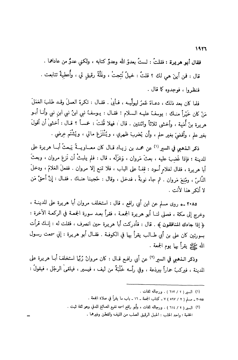 2085 - * روى مسلم عن ابن أبي رافع، قال: استخلف مروان أبا هريرة على المدينة، وخرج إلى مكة، فصلى لنا أبو هريرة الجمعة، فقرأ بعد سورة الجمعة في الركعة الآخرة: {إِذَا جَاءَكَ الْمُنَافِقُونَ}. قال: فأدركت أبا هريرة حين انصرف، فقلت له: إنك قرأت بسورتين كان علي بن أبي طالب يقرأ بهما في الكوفة. فقال أبو هريرة: إني سمعت رسول الله صلى الله عليه وسلم يقرأ بهما يوم الجمعة.