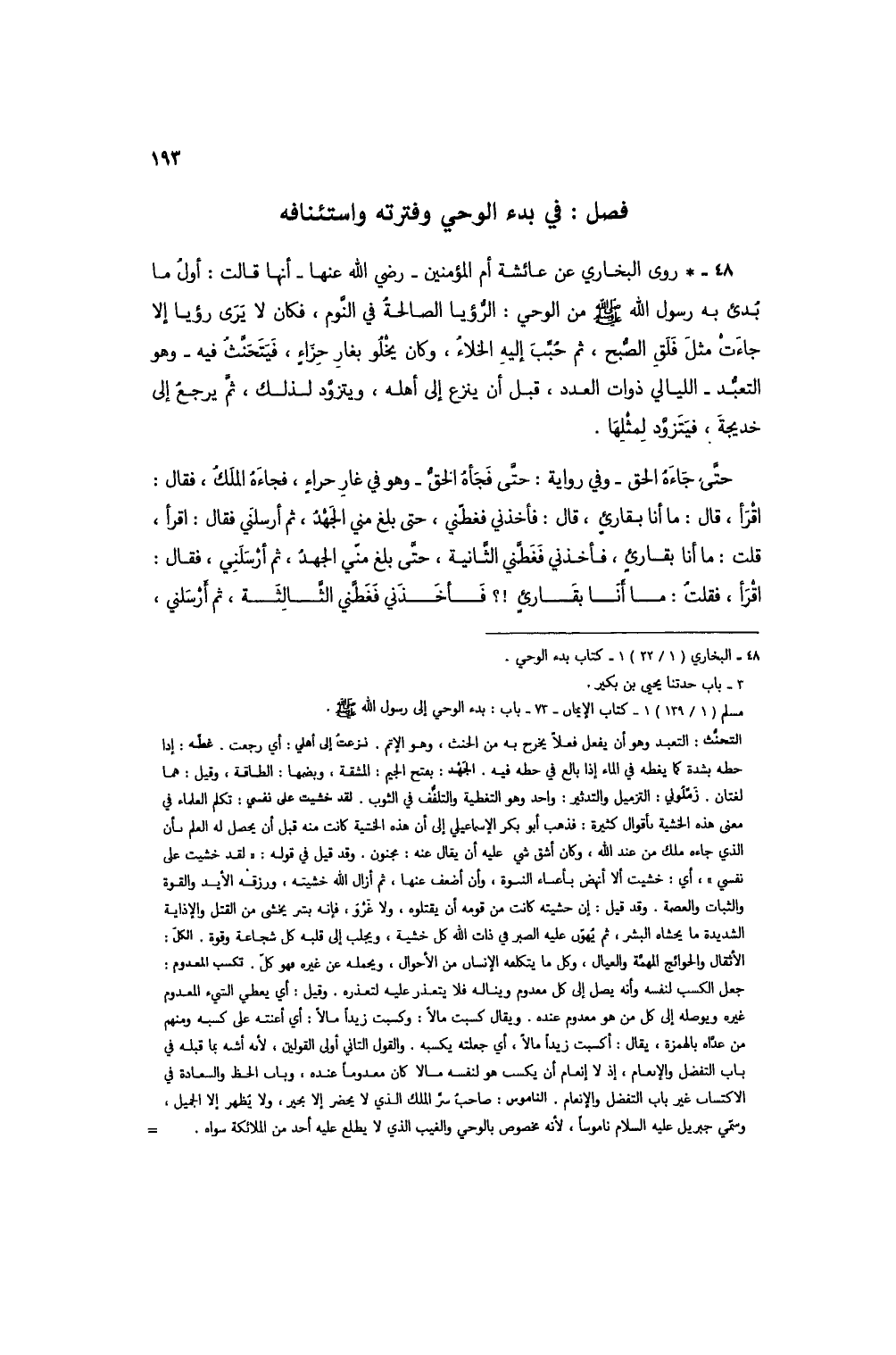 التحنُّث: التعبد وهو أن يفعل فعلاً يخرج به من الحنث، وهو الإثم. نزعتُ إلى أهلي: أي رجعت. غطه: إذا حطه بشدة كما يغطه في الماء إذا بالغ في حطه فيه. الجهد: بفتح الجيم: المشقة، وبضمها: الطاقة، وقيل: هما لغتان. زملوني: التزميل والتدثير: واحد وهو التغطية والتلفف في الثوب. لقد خشيت على نفسي تكلم العلماء في معنى هذه الخشية بأقوال كثيرة: فذهب أبو بكر الإسماعيلي إلى أن هذه الخشية كانت منه قبل أن يحصل له العلم بأن الذي جاءه ملك من عند الله، وكان أشق شيء عليه أن يقال عنه: مجنون. وقد قيل في قوله: "لقد خشيت على نفسي"، أي: خشيت ألا أنهض بأعباء النسوة، وأن أضعف عنها، ثم أزال الله خشيته، ورزقه الأيد والقوة والثبات والعصمة، وقد قيل: إن خشيته كانت من قومه أن يقتلوه، ولا غرو، فإنه بشر يخشى من القتل والإذاية الشديدة ما يخشاه البشر، ثم يهون عليه الصبر في ذات الله كل خشية، ويجلب إلى قلبه كل شجاعة قوة. الكل: الأثقال والحوائج المهمة والعيال، وكل ما يتكلفه الإنسان من الأحوال، ويحمله عن غيره فهو كلّ. تكسب المعدوم: جعل الكسب لنفسه وأنه يصل إلى كل معدوم ويناله فلا يتعذر عليه لتعذره. وقيل: أي يعطي الشيء المعدوم غيره ويوصله إلى كل من هو معدوم عنده. ويقال كسبت مالاً: وكسبت زيداً مالاً: أي أعنته على كسبه ومنهم من عداه بالهمزة، يقال: أكسبت زيداً مالاً، أي جعلته يكسبه. والقول الثاني أولى القولين، لأنه أشبه بما قبله في باب التفضل والإنعام، إذ لا إنعام أن يكسب هو لنفسه مالاً كان معدوماً عنده، وباب الحظ السعادة في الاكتساب غير باب التفضل والإنعام، الناموس: صاحب سر الملك الذي لا يحضر إلا بخير، ولا يُظهر إل الجميل، وسمي جبريل عليه السلام ناموساً، لأنه مخصوص بالوحي والغيب الذي لا يطلع عليه أحد من الملائكة سواه. =