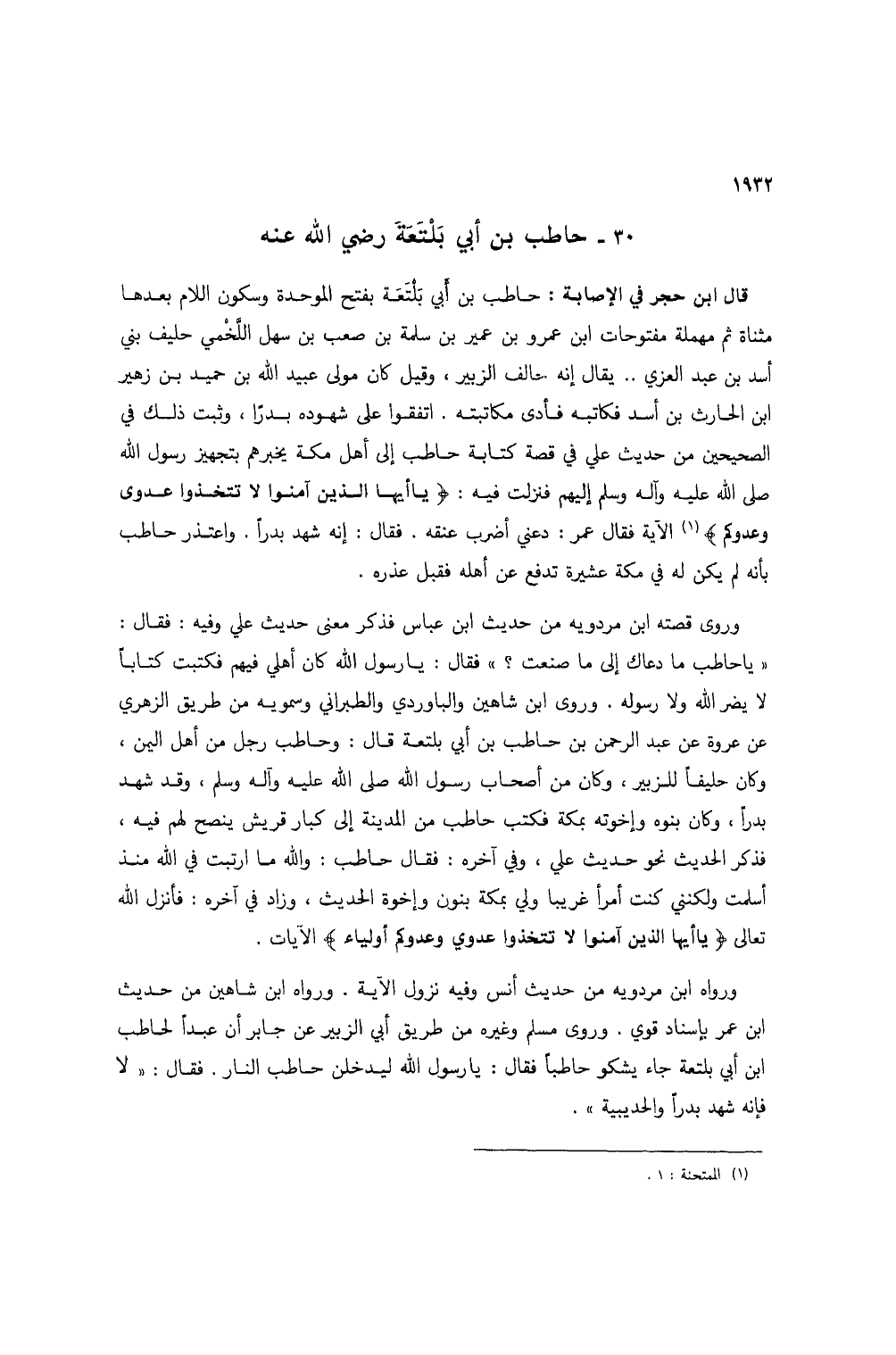 قال ابن حجر في الإصابة: حاطب بن أبي بلتعة بفتح الموحدة وسكون اللام بعدها مثناة ثم مهملة مفتوحات ابن عمرو بن عمير بن سلمة بن صعب بن سهل اللخمي حليف بني أسد بن عبد العزي ... يقال إنه حالف الزبير، وقيل كان مولى عبيد الله بن حميد بن زهير ابن الحارث بن أسد فكاتبه فأدى مكاتبته. اتفقوا على شهوده بدرًا، وثبت ذلك في الصحيحين من حديث علي في قصة كتابة حاطب إلى أهل مكة يخبرهم بتجهيز رسول الله صلى الله عليه وآله وسلم إليهم فنزلت فيه: (يا أيها الذين آمنوا لا تتخذوا عدوي وعدوكم) الآية فقال عمر: دعني أضرب عنقه. فقال: إنه شهد بدرًا. واعتذر حاطب بأنه لم يكن له في مكة عشيرة تدفع عن أهله فقبل عذره.