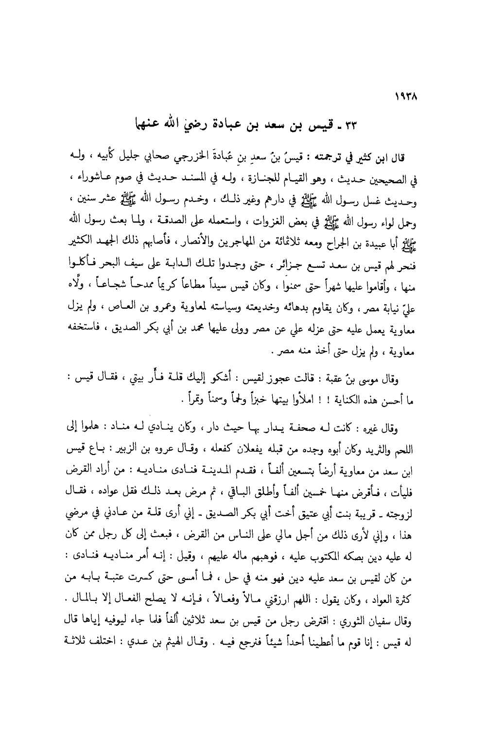 قال ابن كثير في ترجمته: قيس بن سعد بن عبادة الخرزجي صحابي جليل كأبيه، وله في الصحيحين حديث، وهو القيام للجنازة، وله في المسند حديث في صوم عاشوراء، وحديث غسل رسول الله صلى الله عليه وسلم في دارهم وغير ذلك، وخدم رسول الله صلى الله عليه وسلم عشر سنين، وحمل لواء رسول الله صلى الله عليه وسلم في بعض الغزوات، واستعمله على الصدقة، ولما بعث رسول الله صلى الله عليه وسلم أبا عبيدة بن الجراح ومعه ثلاثمائة من المهاجرين والأنصار، فأصابهم ذلك الجهد الكثير فنحر لهم قيس بن سعد تسع جزائر، حتى وجدوا تلك الدابة على سيف البحر فأكلوا منها، وأقاموا عليها شهرًا حتى سمنوا، وكان قيس سيدًا مطاعًا كريمًا ممدحًا شجاعًا، ولاه على نيابة مصر، وكان يقاوم بدهائه وخديعته وسياسته لمعاوية وعمرو بن العاص، ولم يزل معاوية يعمل عليه حتى عزله علي عن مصر وولى عليها محمد بن أبي بكر الصديق، فاستخفه معاوية، ولم يزل حتى أخذ منه مصر.