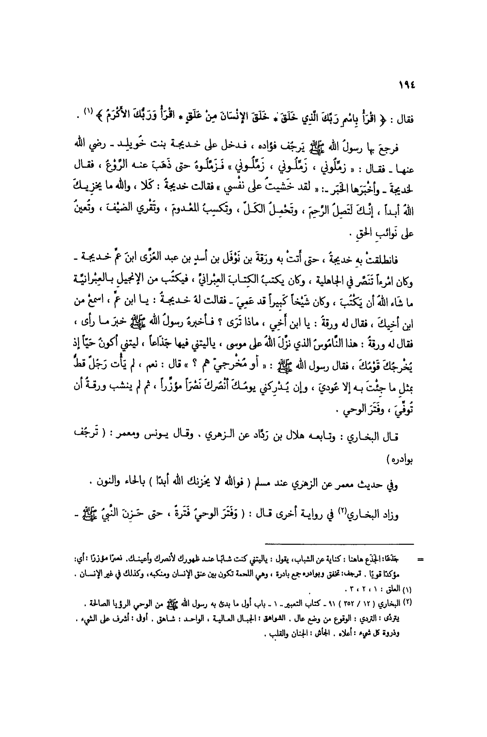 (2) البخاري (12/ 352) 11 - كتاب التعبير - 1 - باب أول ما بدئ به رسول الله صلى الله عليه وسلم من الوحي الرؤيا الصالحة. يتردى: التردي: الوقوع من وضع عال، الشواهق: الجبال العالية، الواحد: شاهق، أوفى: أشرف على الشيء. وذروة كل شيء: أعلاه، الجأش: الجنان والقلب.