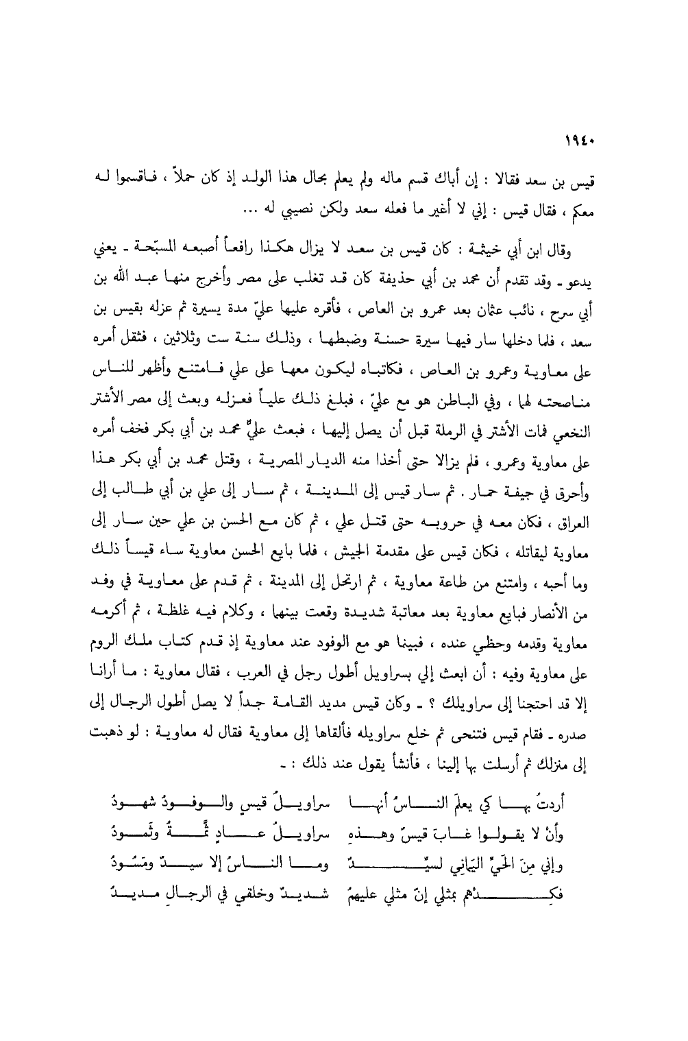 وقال ابن أبي خيثمة: كان قيس بن سعد لا يزال هكذا رافعًا أصبعه المسبحة -يعني يدعو- وقد تقدم أن محمد بن أبي حذيفة كان قد تغلب على مصر وأخرج منها عبد الله بن أبي سرح، نائب عثمان بعد عمرو بن العاص، فأقره عليها علي مدة يسيرة ثم عزله بقيس بن سعد، فلما دخلها سار فيها سيرة حسنة وضبطها، وذلك سنة ست وثلاثين، فثقل أمره على معاوية وعمرو بن العاص، فكاتباه ليكون معها على علي فامتنع وأظهر للناس مناصحته لهما، وفي الباطن هو مع علي، فبلغ ذلك عليًا فعزله وبعث إلى مصر الأشتر النخعي فمات الأشتر في الرملة قبل أن يصل إليها، فبعث علي محمد بن أبي بكر فخف أمره على معاوية وعمرو، فلم يزالا حتى أخذا منه الديار المصرية، وقتل محمد بن أبي بكر هذا وأحرق في جيفة حمار. ثم سار قيس إلى المدينة، ثم سار إلى علي بن أبي طالب إلى العراق، فكان معه في حروبه حتى قتل علي، ثم كان مع الحسن بن علي حين سار إلى معاوية ليقاتله، فكان قيس على مقدمة الجيش، فلما بايع الحسن بن علي حين سار إلى معاوية ليقتله، فكان قيس على مقدمة الجيش، فلما بايع الحسن معاوية ساء قيسًا ذلك وما أحبه، وامتنع من طاعة معاوية، ثم ارتحل إلى المدينة، ثم قدم على معاوية في وفد من الأنصار فبايع معاوية بعد معاتبة شديدة وقعت بينهما، وكلام فيه غلظة، ثم أكرمه معاوية وقدمه وحظي عنده، فبينما هو مع الوفود عند معاوية إذ قدم كتاب ملك الروم على معاوية وفيه: أن ابعث إلي بسراويل أطول رجل في العرب، فقال معاوية: ما أرانا إلا قد احتجنا إلى سراويلك؟ -وكان قيس مديد القامة جدًا لا يصل أطول الرجال إلى صدره- فقام قيس فتنحى ثم خلع سراويله فألقاها إلى معاوية فقال له معاوية: لو ذهبت إلى منزلك ثم أرسلت بها إلينا، فأنشأ يقول عن ذلك: