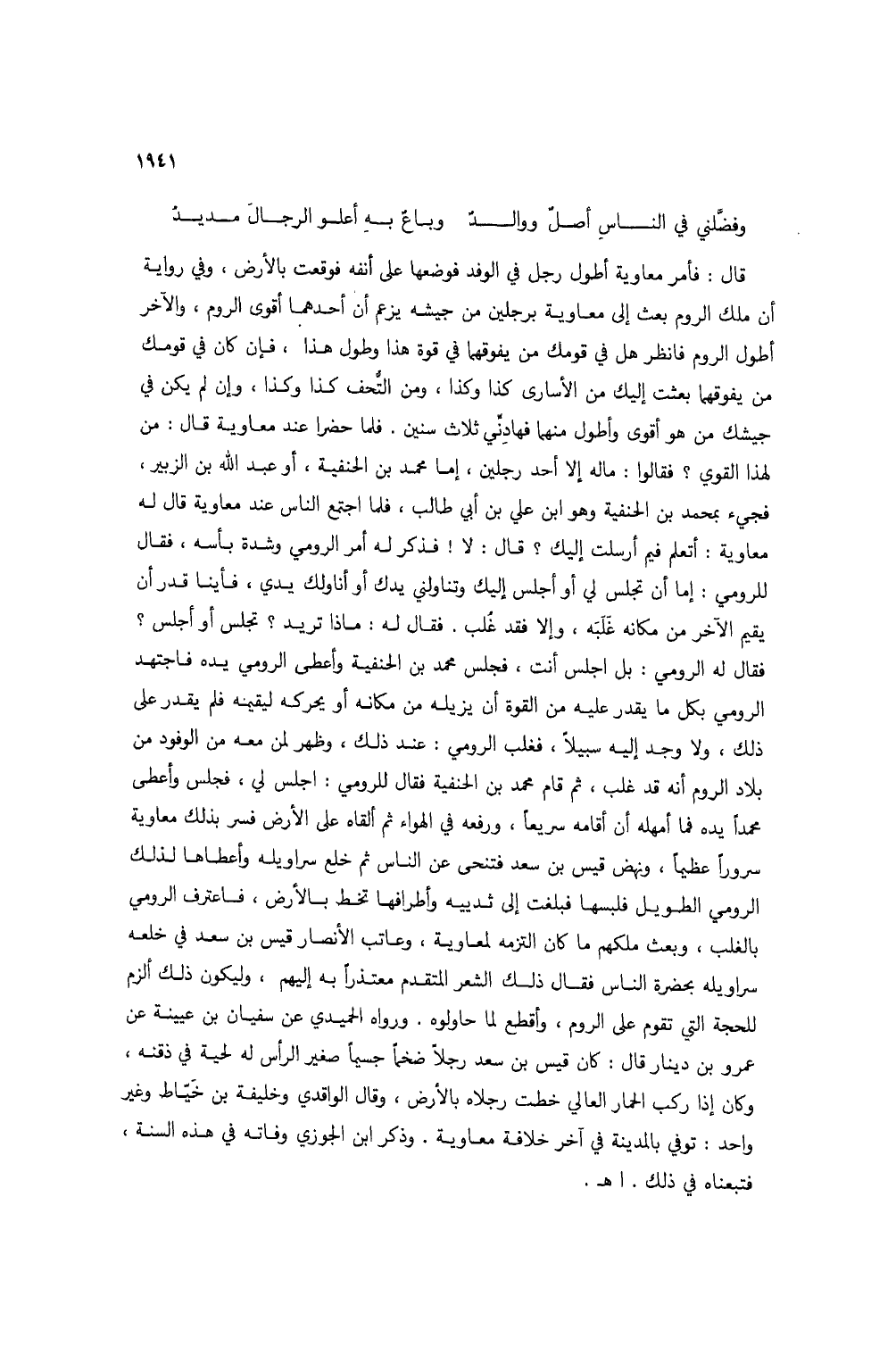 قال: فأمر معاوية أطول رجل في الوفد فوضعها على أنفه فوقعت بالأرض، وفي رواية أن ملك الروم بعث إلى معاوية برجلين من جيشه يزعم أن أحدهما أقوى الروم، والآخر أطول الروم فانظر هل في قومك من يفوقهما في قوة هذا وطول هذا، فإن كان في قومك من يفوقهما بعثت إليك من الأسارى كذا وكذا، ومن التحف كذا وكذا، وإن لم يكن في جيشك من هو أقوى وأطول منهما فهادني ثلاث سنين. فلما حضرا عند معاوية قال: من لهذا القوي؟ فقالوا: ماله إلا أحد رجلين، إما محمد بن الحنفية، أو عبد الله بن الزبير، فجيء بمحمد بن الحنفية وهو ابن علي بن أبي طالب، فلما اجتمع الناس عند معاوية قال له معاوية: أتعلم فيم أرسلت إليك؟ قال: لا! فذكر له أمر الرومي وشدة بأسه، فقال للرومي: إما أن تجلس لي أو أجلس إليك وتناولني يدك أو أناولك يدي، فأينا قدر أن يقيم الآخر من مكانه غلبه، وإلا فقد غلب. فقال له: ماذا تريد؟ تجلس أو أجلس؟ فقال له الرومي: بل اجلس أنت، فجلس محمد بن الحنفية وأعطى الرومي يده فاجتهد الرومي بكل ما يقدر عليه من القوة أن يزيله من مكانه أو يحركه ليقيمه فلم يقدر على ذلك، ولا وجد إليه سبيلاً، فغلب الرومي: عند ذلك، وظهر لمن معه من الوفود من بلاد الروم أنه قد غلب، ثم قام محمد بن الحنفية فقال للرومي: اجلس لي، فجلس وأعطى محمداً يده فما أمهله أن أقامه سريعاً، ورفعه في الهواء ثم ألقاه على الأرض فسر بذلك معاوية سروراً عظيماً، ونهض قيس بن سعد فتنحى عن الناس ثم خلع سراويله وأعطاها لذلك الرومي الطويل فلبسها فبلغت إلى ثدييه وأطرافها تخط بالأرض، فاعترف الرومي بالغلب، وبعث ملكهم ما كان التزمه لمعاوية، وعاتب الأنصار قيس بن سعد في خلعه سراويله بحضرة الناس فقال ذلك الشعر المتقدم معتذراً به إليهم، وليكون ذلك ألزم للحجة التي تقوم على الروم، وأقطع لما حاولوه. ورواه الحميدي عن سفيان بن عيينة عن عمرو بن دينار قال: كان قيس بن سعد رجلاً ضخماً جسيماً صغير الرأس له لحية في ذقنه، وكان إذا ركب الحمار العالي خطت رجلاه بالأرض، وقال الواقدي وخليفة بن خياط وغير واحد: توفي بالمدينة في آخر خلافة معاوية. وذكر ابن الجوزي وفاته في هذه السنة، فتبعناه في ذلك. اهـ.