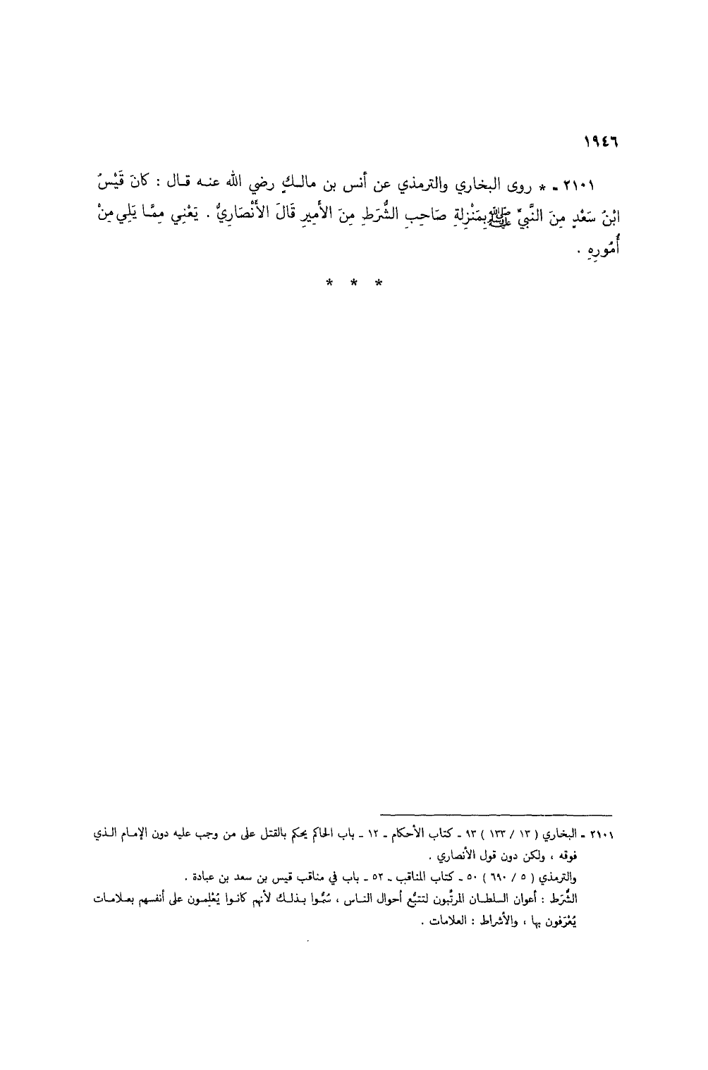 2101 - * روى البخاري والترمذي عن أنس بن مالك رضي الله عنه قال: كان قيس ابن سعد من النبي صلى الله عليه وسلم بمنزلة صاحب الشرط من الأمير قال الأنصاري. يعني مما يلي من أموره.